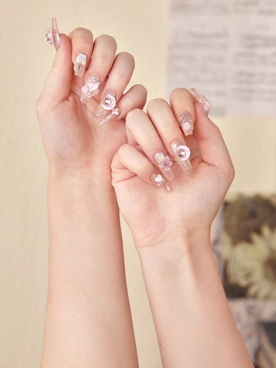 Kawaii 10 piezas largo ataúd corazón y luna adorno Uña postiza Kit