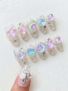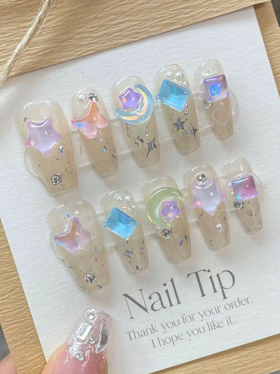 Kawaii 10 Piezas De Uñas Postizas Impresas Con Luna Y Estrella Y 1 Rollo De Cinta