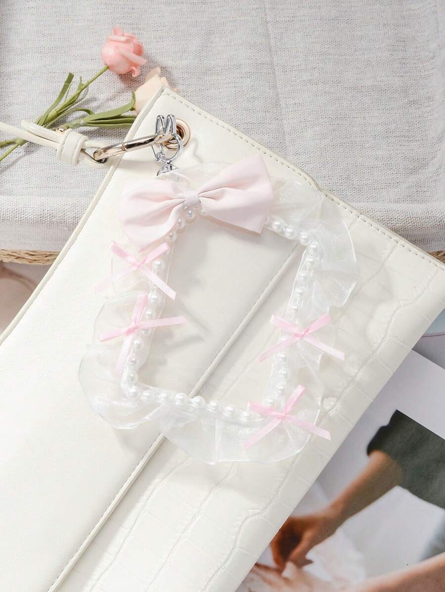Kawaii 1 pieza Soporte de tarjeta con lazo de cinta rosa claro de estilo elegante y adorable, perla falsa, encaje de malla blanca transparente y llavero de conejo, adecuado para trabajadores de oficina, estudiantes, mujeres, uso diario, regalo de vacaciones