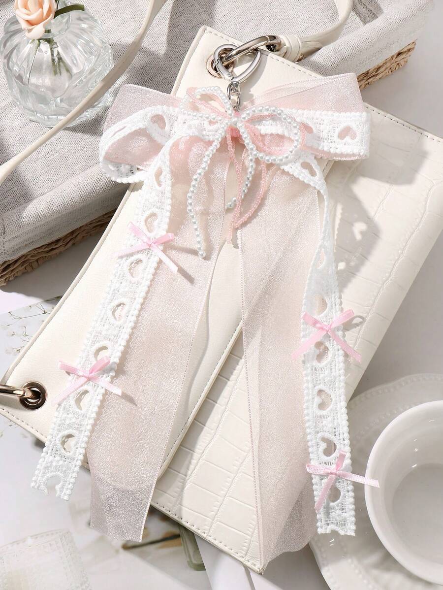 Kawaii 1 pieza Colgante versátil de alta calidad hecho a mano con perlas falsas y cristales falsos en forma de corazón hueco y lazo, adecuado como llavero, accesorio para teléfono o colgante para bolso, para mujeres y niñas, para uso diario o como regalo