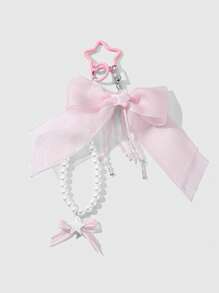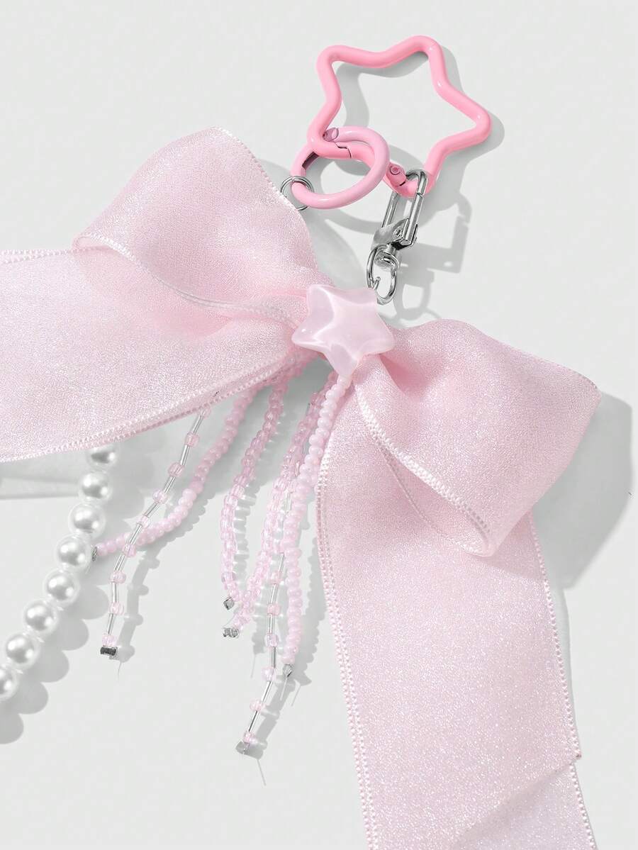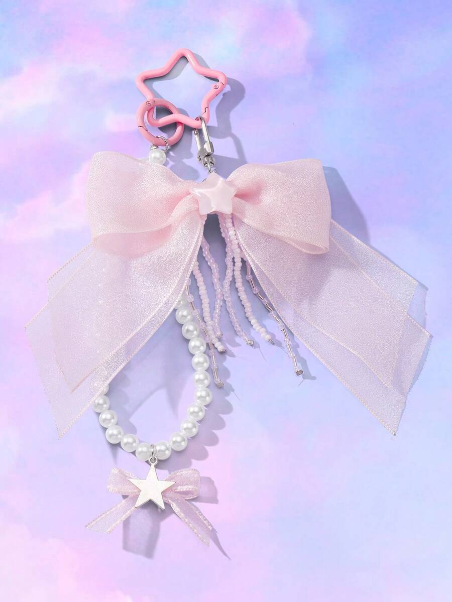Kawaii 1 pieza Elegante y dulce accesorio hecho a mano con perlas falsas blancas, cristales falsos, lazo de malla y decoración de estrella, ideal como llavero, dije de bolso, dije de teléfono, adecuado para niñas y mujeres como uso diario o regalo de festividad