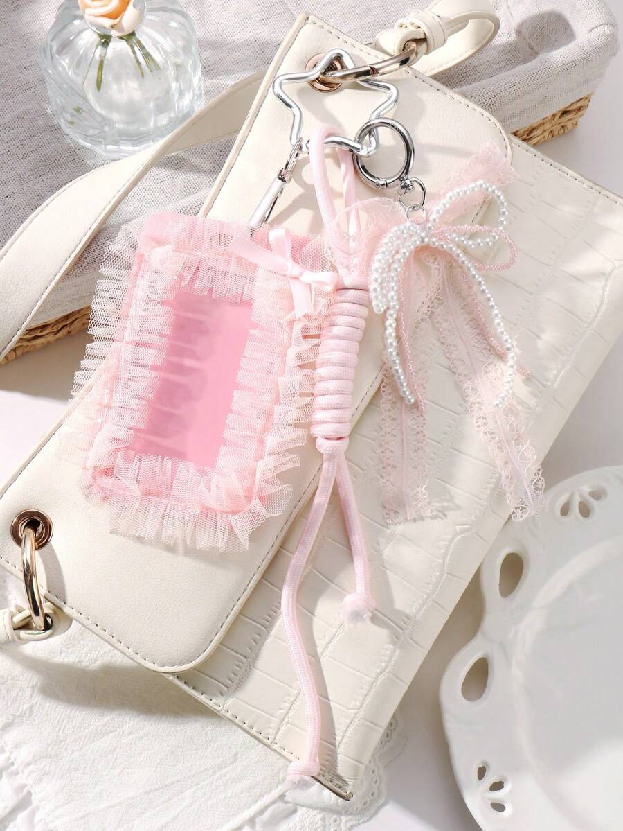 Kawaii 1 pieza de Cordón de identificación hecho a mano con cuentas, lazo de cinta de malla de perlas y cristales falsos, portador de tarjeta trenzado ajustable y versátil, llavero y adorno de bolso DIY, adecuado para trabajadores de oficina, estudiantes, uso diario y regalo de vacaciones
