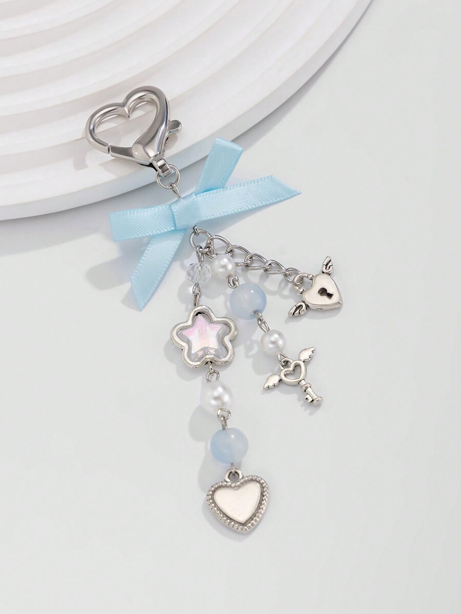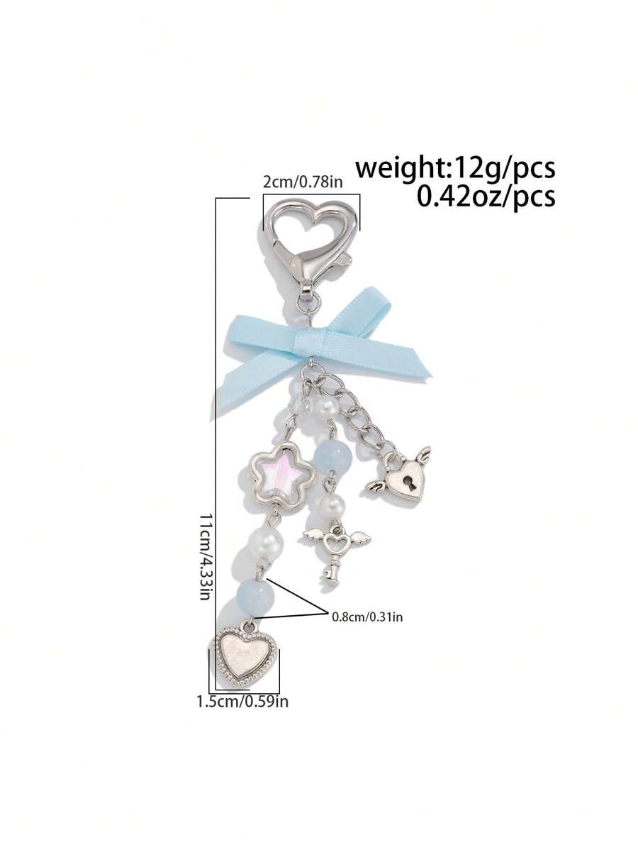 Kawaii 1 pieza Llavero hecho a mano con alas de ángel en forma de lazo, borla y perla azul, regalo romántico y lindo para fiestas