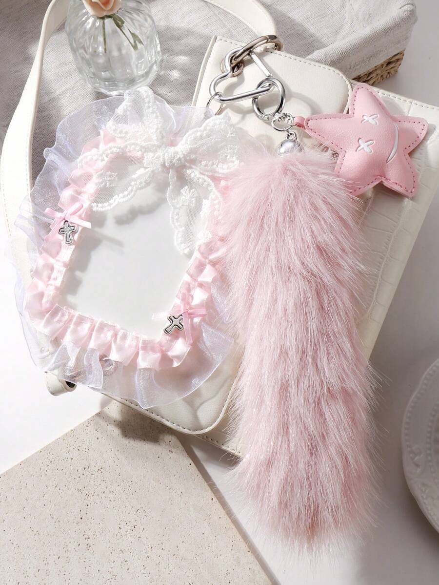 Kawaii 1 pieza Estilo coreano INS lindo y dulce, de alta calidad, con cola de peluche rosa, cara sonriente, estrella, lazo, decoración de cruz, portador de tarjeta y llavero, adecuado para trabajadores de oficina, estudiantes, uso diario, regalo de festival