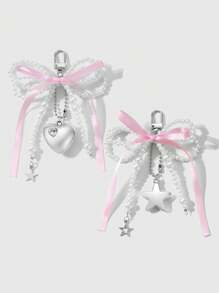 Kawaii 1 pieza Estilo Ins Elegante Conjunto de llavero y dije con perlas artificiales blancas hechas a mano, lazo de cinta rosa, cadena de perlas plateadas y dije de estrella y corazón de diamante CCB, adecuado para niñas, hermanas, mejores amigas, uso diario, regalo de vacaciones