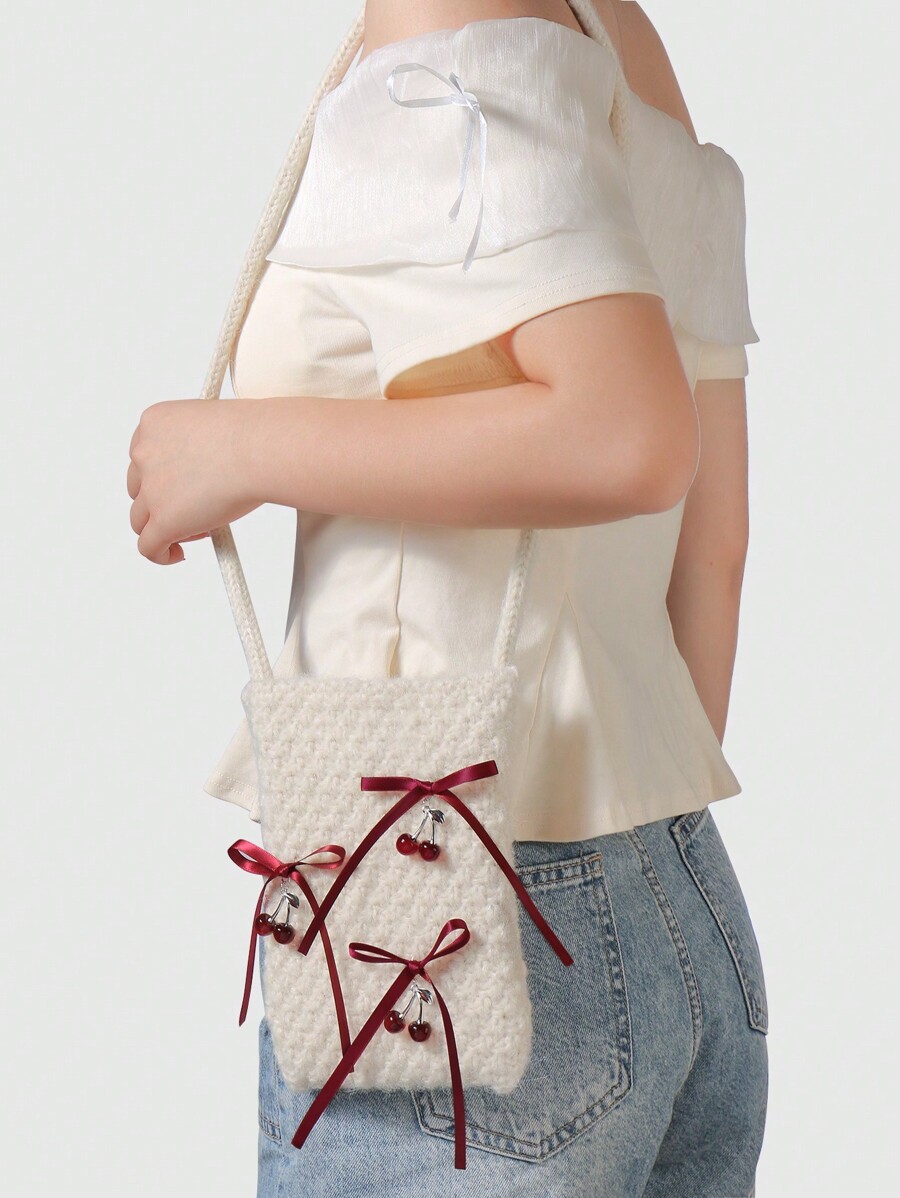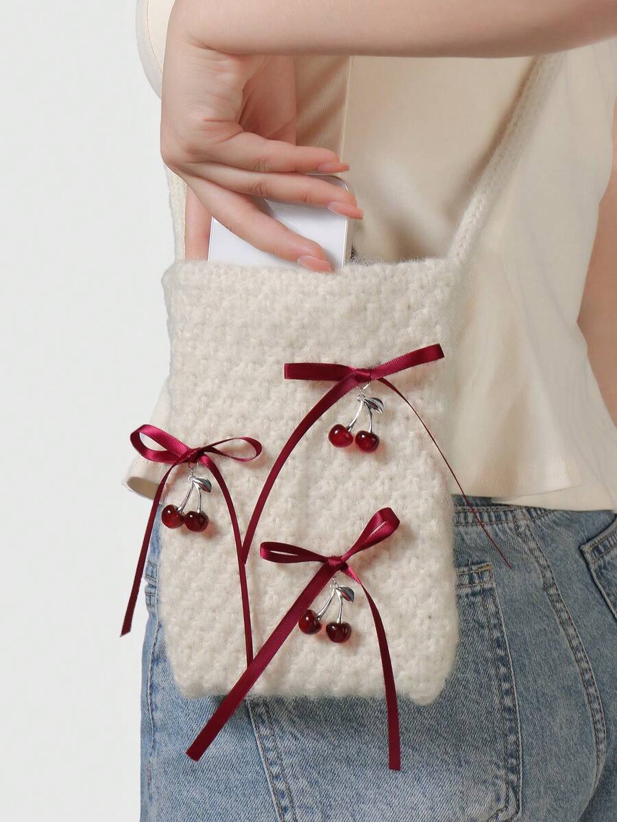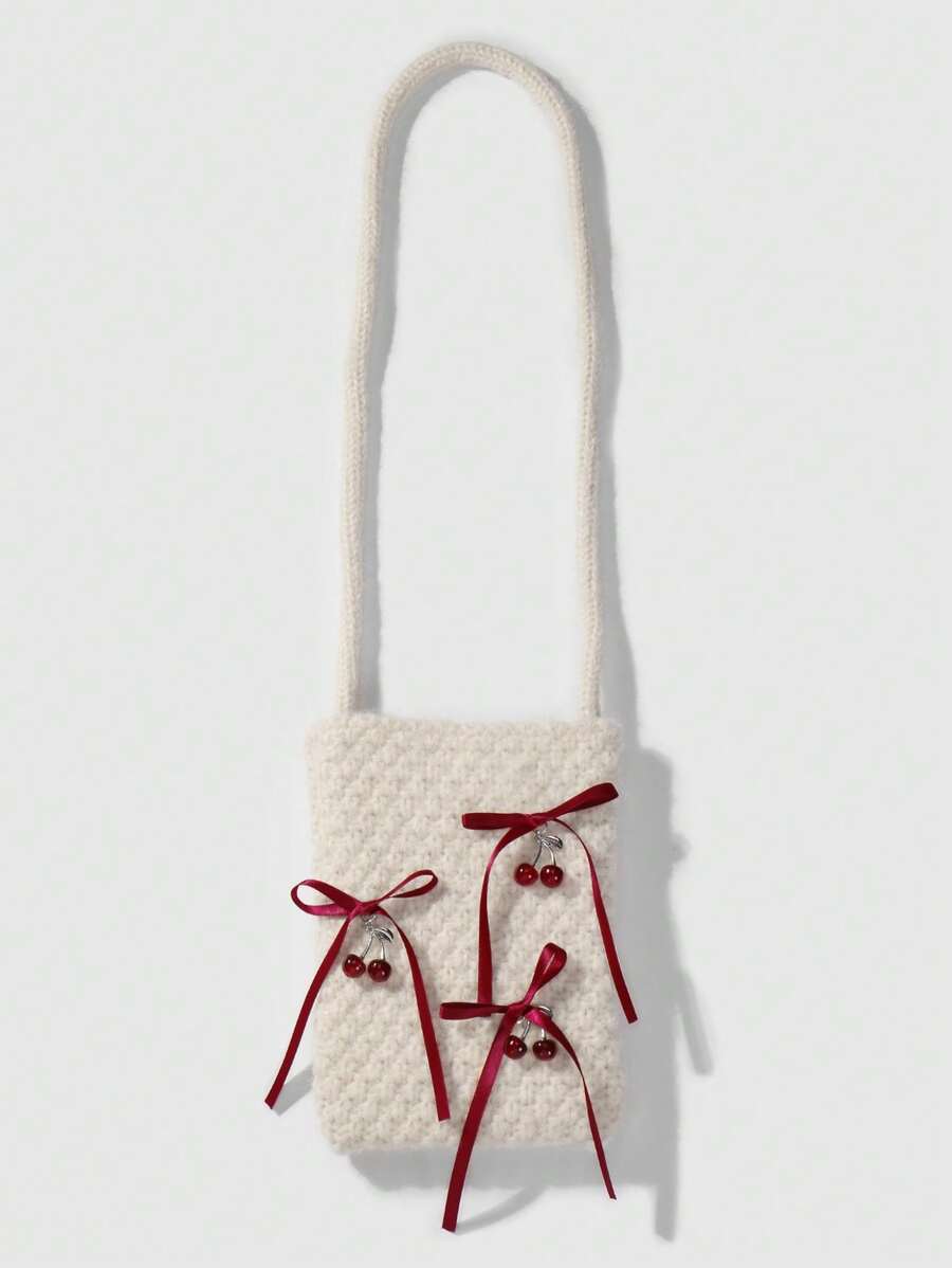 Kawaii 1 pieza Elegante bolso de hombro cruzado de punto estilo coreano simple con lazo de cinta de cereza, adecuado para ir al trabajo, de alta calidad, para otoño/invierno, regalo para mujeres