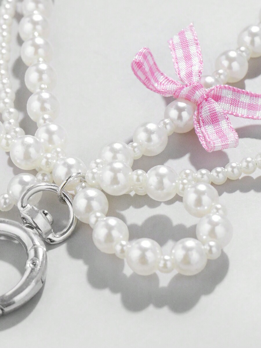 Kawaii 1 pieza Llavero y llavero de cinta de perlas y lazo rosa a cuadros al estilo coreano, regalo de festival