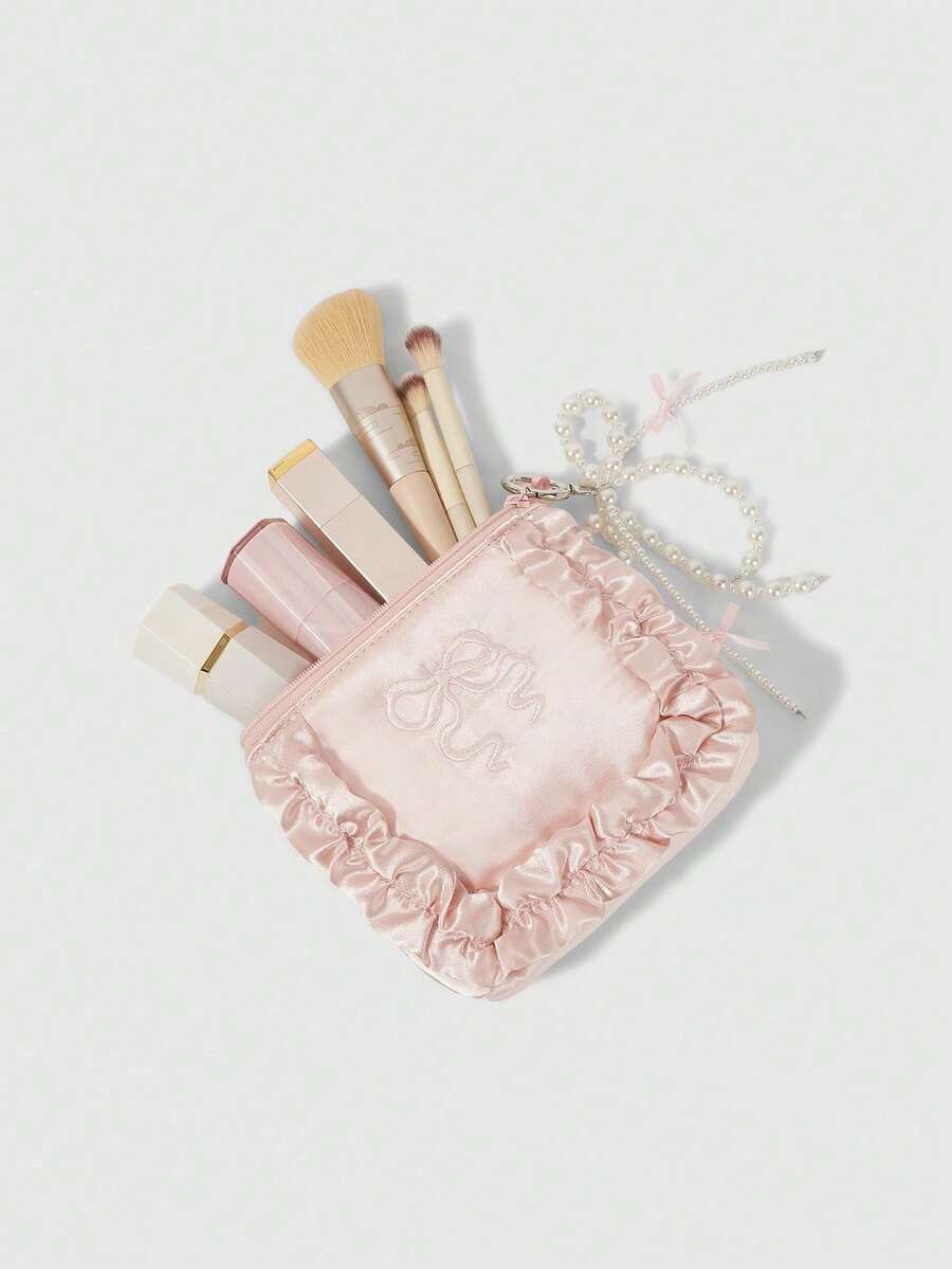 Kawaii 1 pieza Bolso de maquillaje con diseño único de varios compartimentos, bordado con lazo, decorado con perlas falsas y borde de encaje con cremallera, puede contener toallas sanitarias, monedero, pañuelos - Regalo para la madre