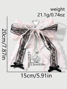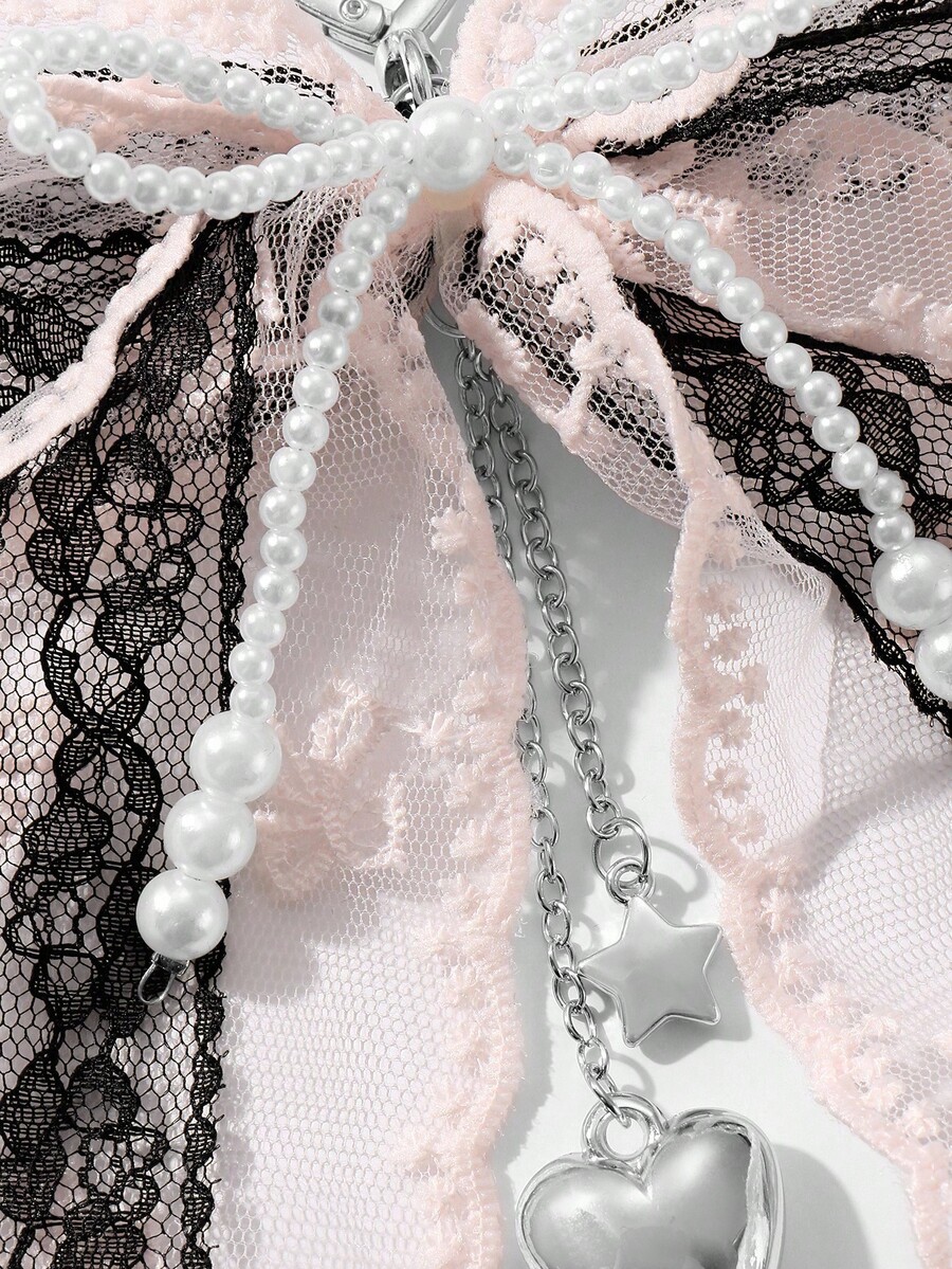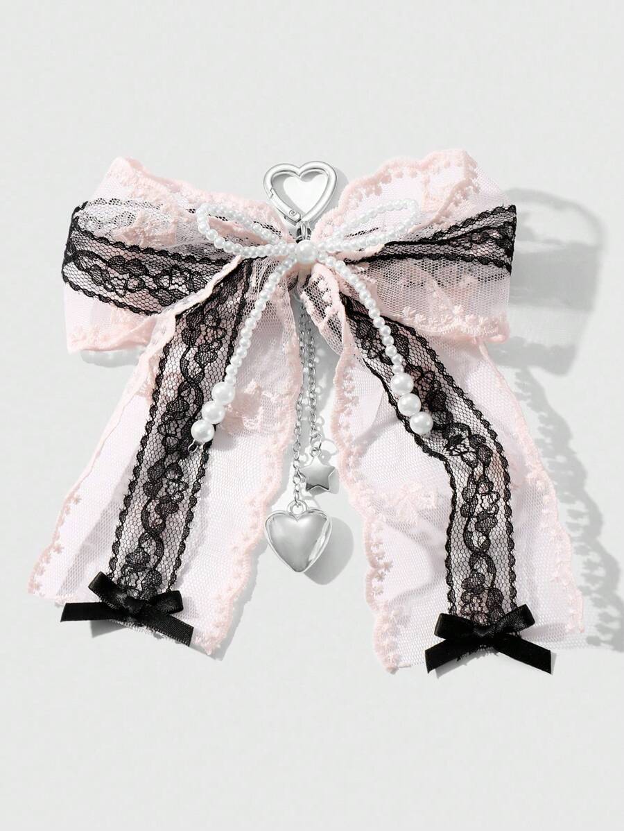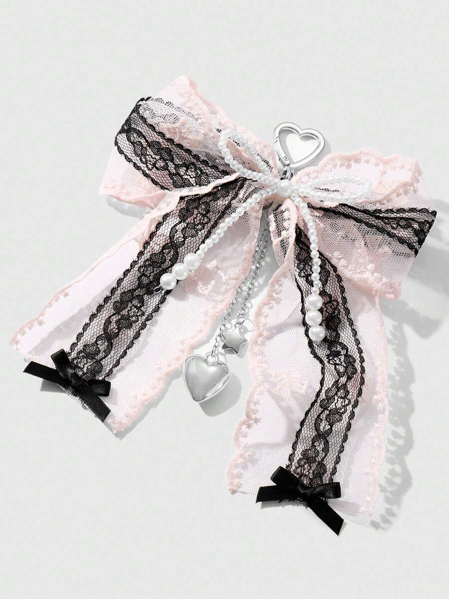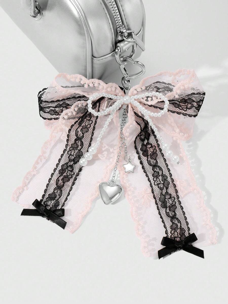 Kawaii 1 pieza Llavero/Encanto para bolso hecho a mano con perla blanca vintage, lazo de encaje rosa y negro, cadena multicapa con corazón y estrella de CCB, elegante y con estilo, adecuado para mujeres y niñas, gran regalo
