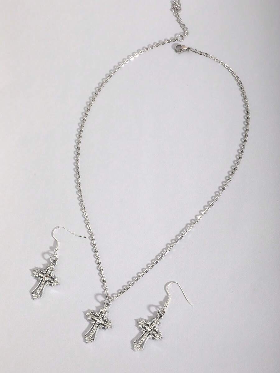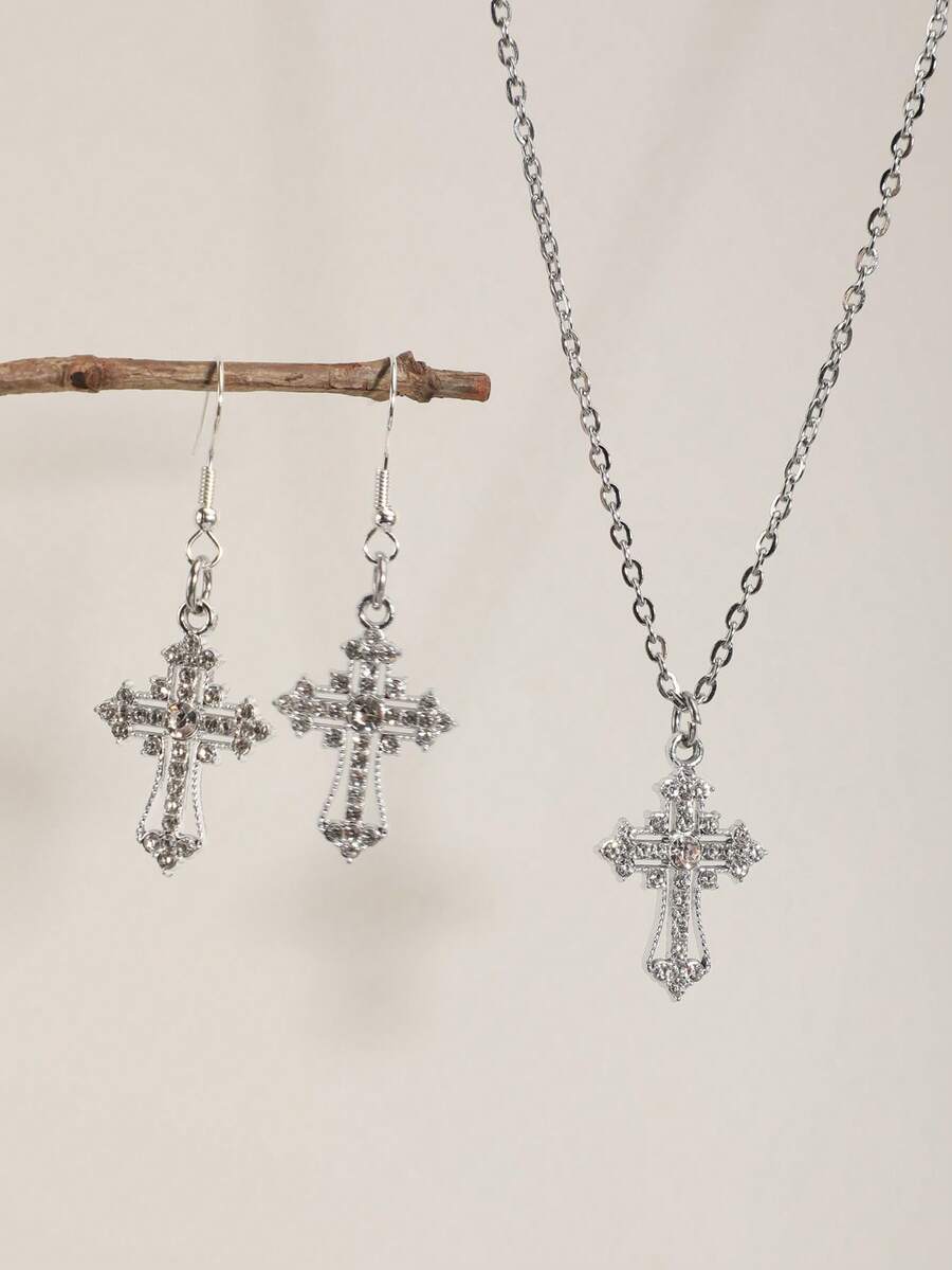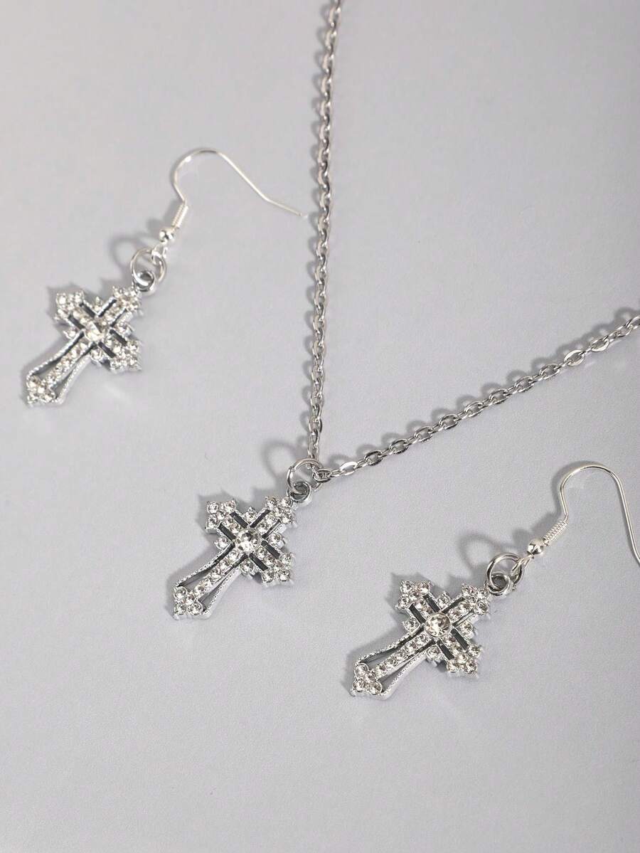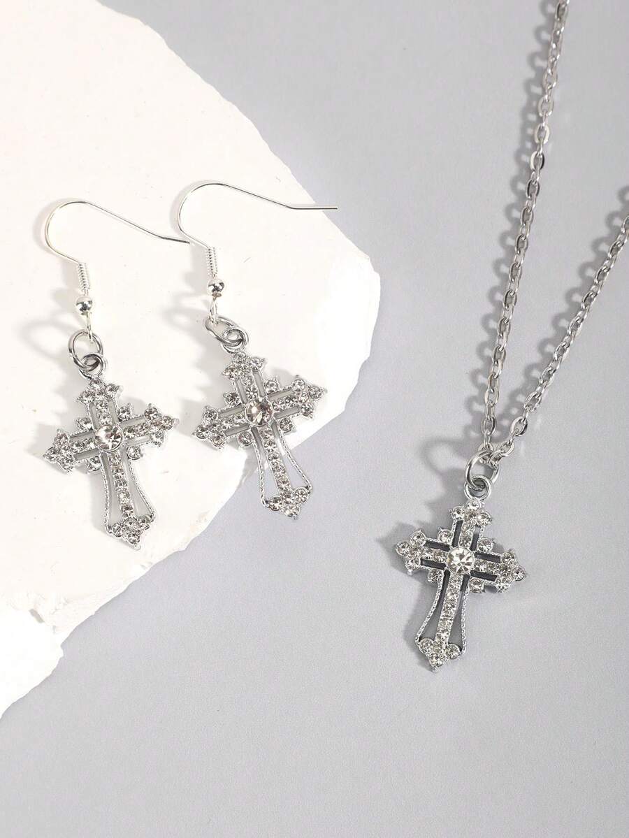 Kawaii 1 pieza Collar con cruz de rhinestone + 1 pieza de aretes con cruz de rhinestone, Elegante y personalizado conjunto de joyería con colgante de cruz de rhinestone de alta gama, adecuado para uso diario, vacaciones y regalos