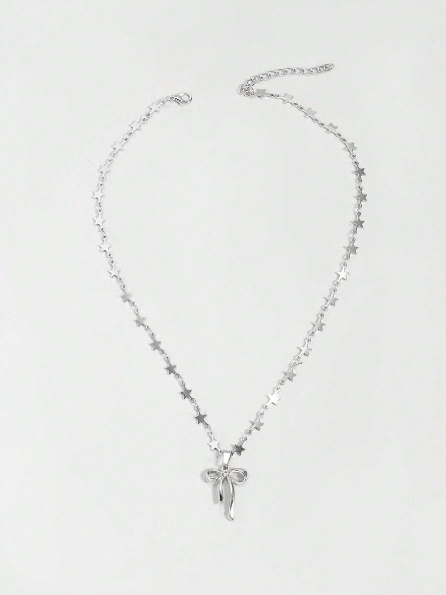Kawaii 1 pieza Collar de mujer con colgante de lazo de cadena de estrella de cinco puntas de color plateado