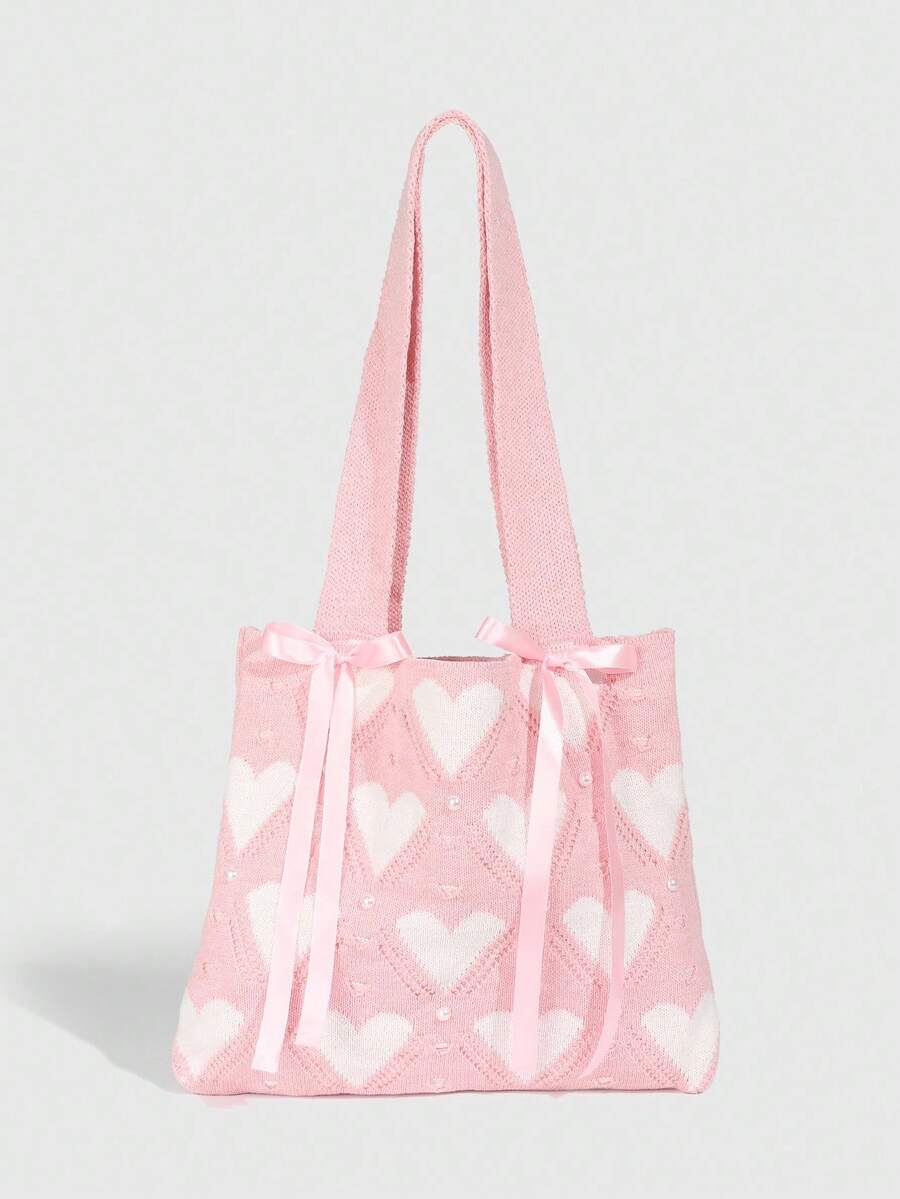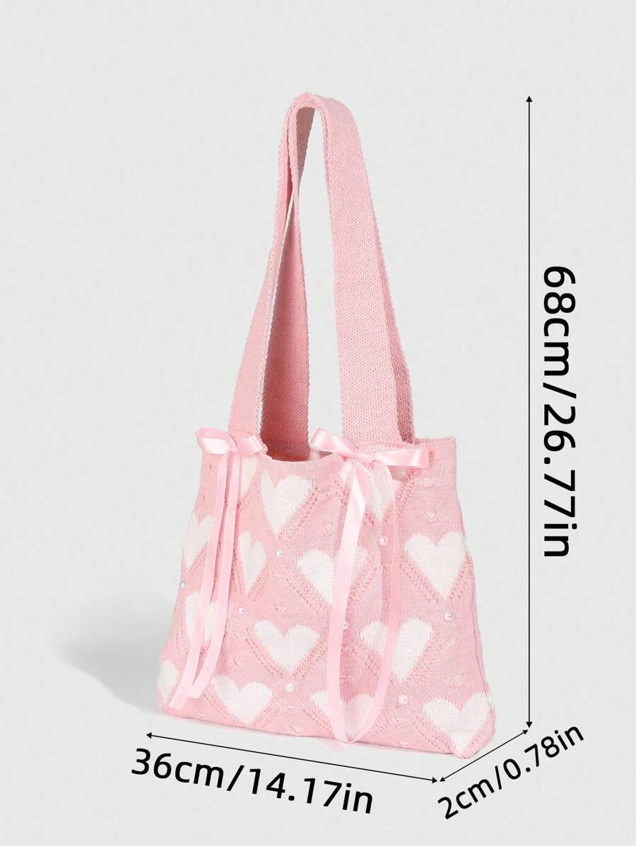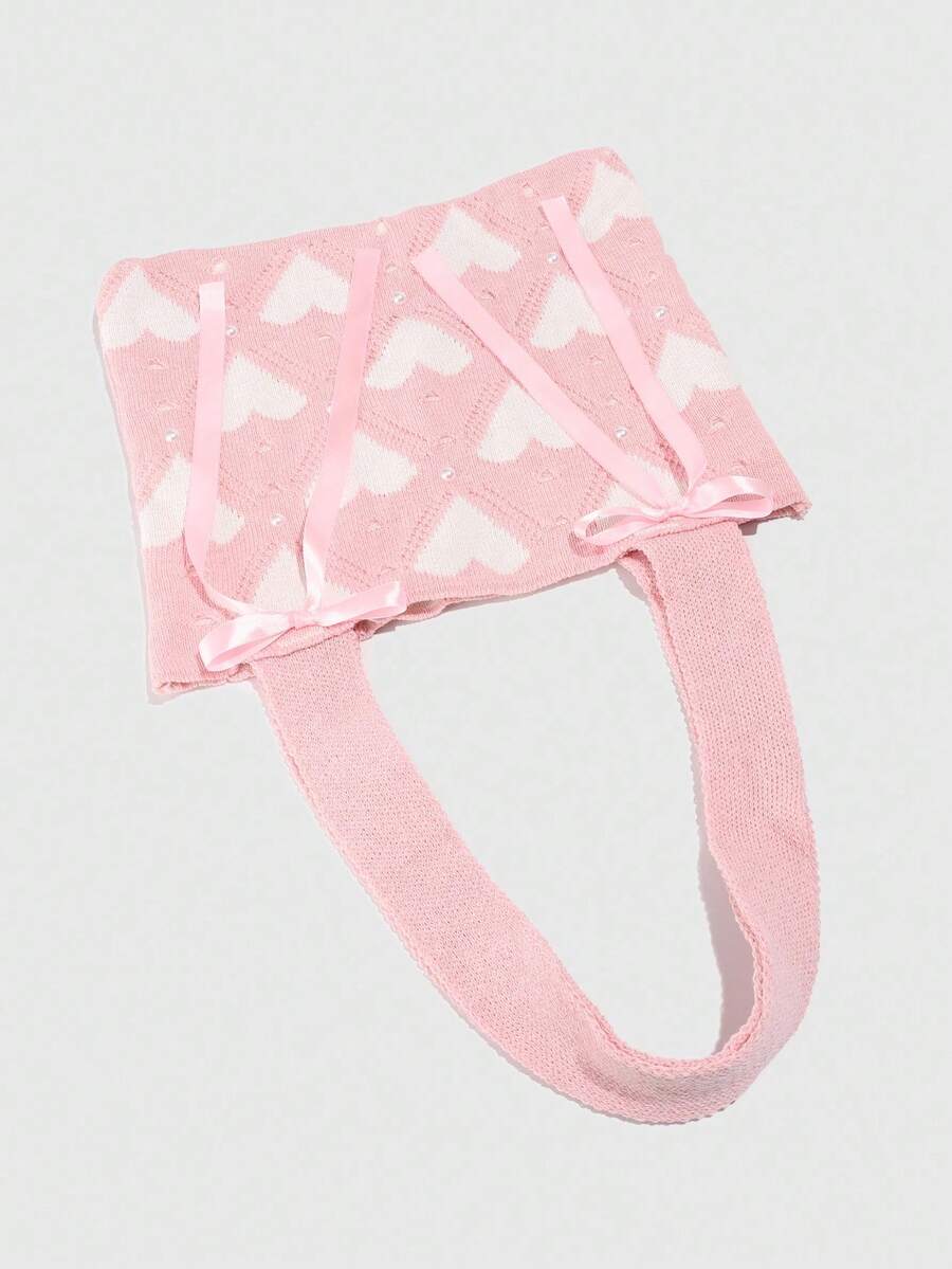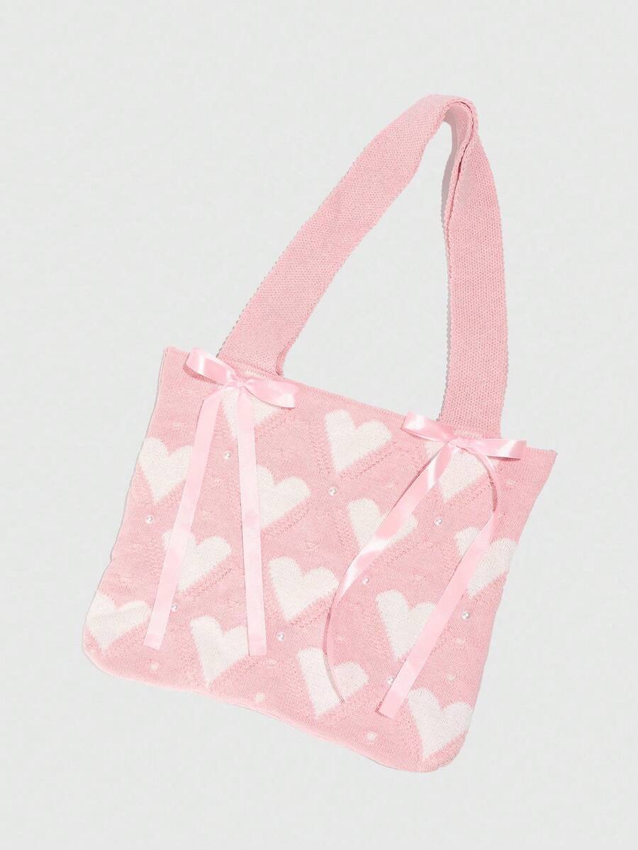 Kawaii 1 pieza Bolso de hombro con lazo rosa dulce, bolso de punto con corazón rosa, bolso de hombro estilo universitario, adecuado para el atuendo diario de las mujeres