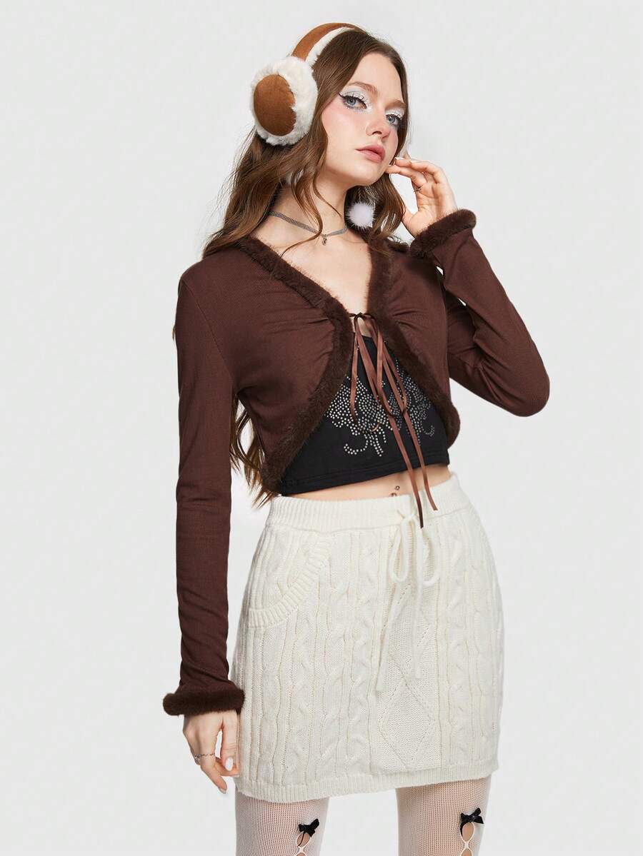 Kawaii 1 pieza Top crop con cordón delantero ribete lanudo de manga amplia