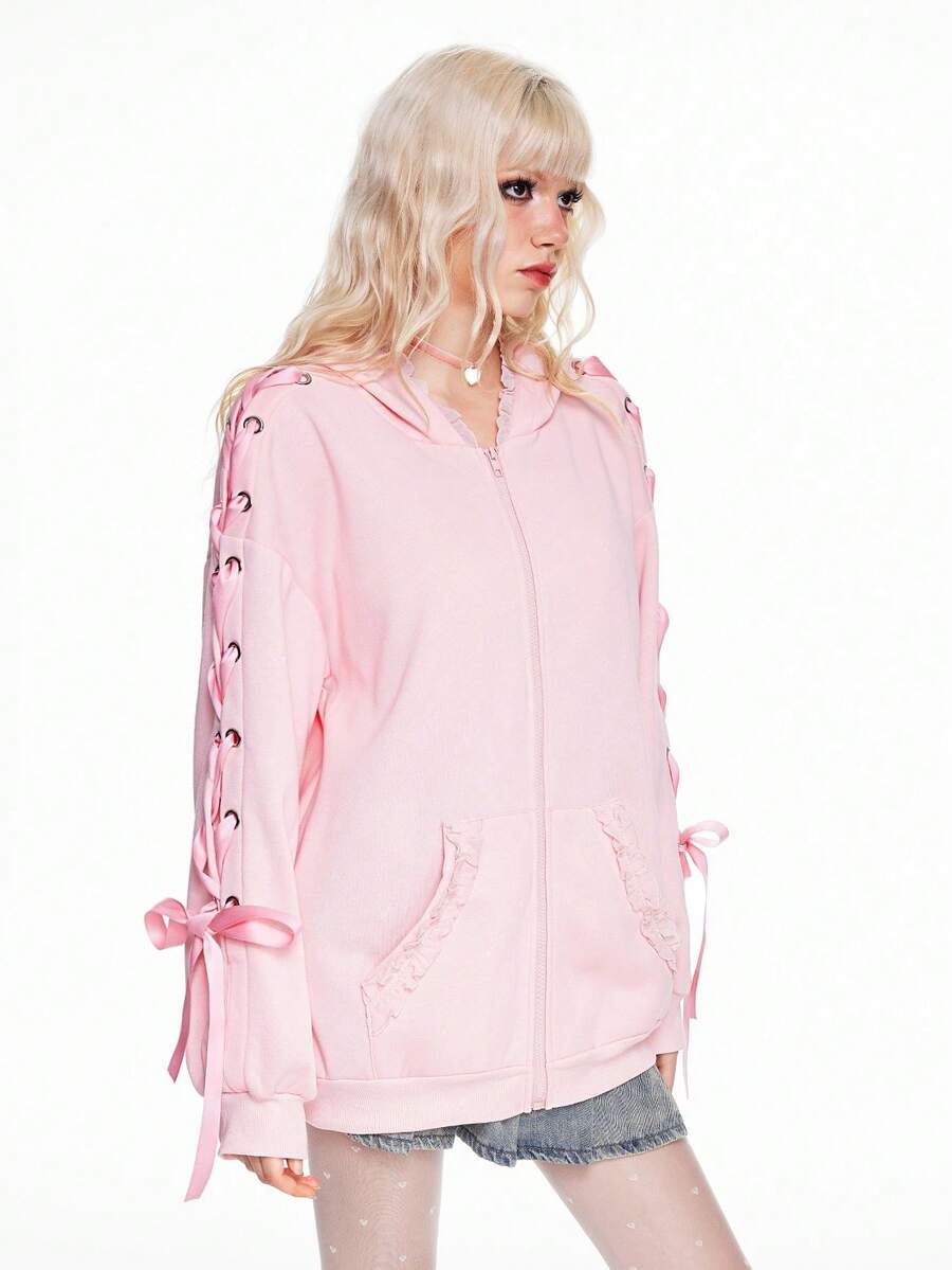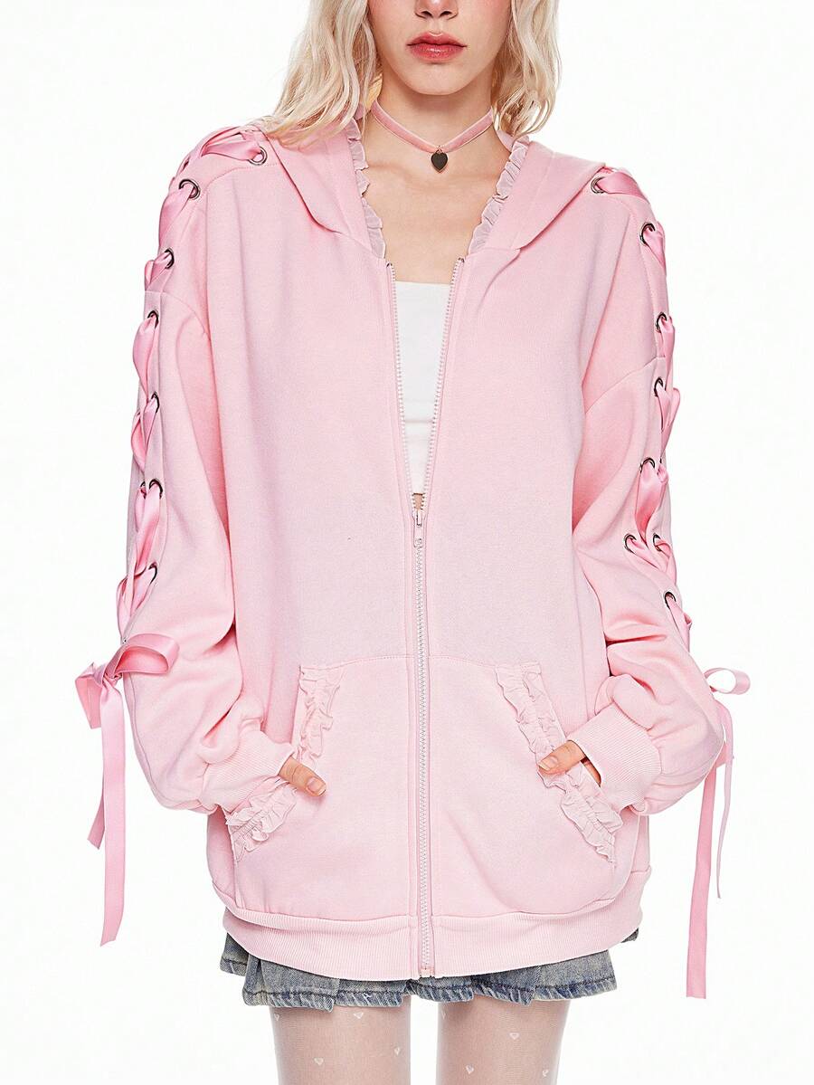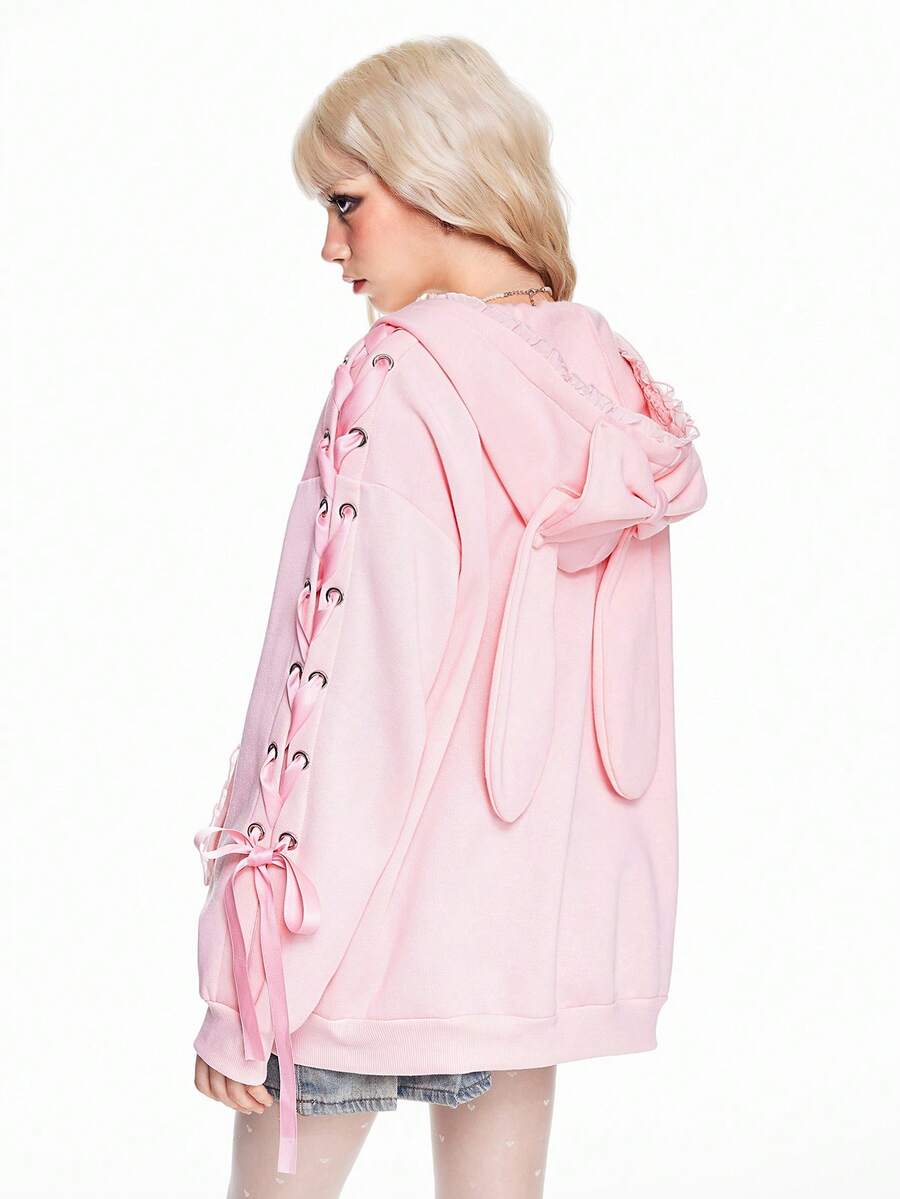Kawaii 1 pieza Sudadera con capucha y cremallera con adornos de orejas de conejo y moño de encaje para mujer