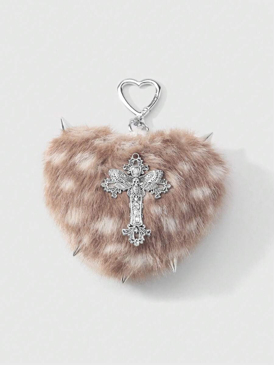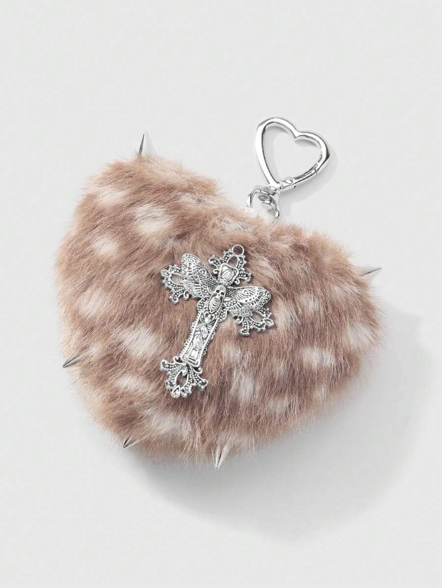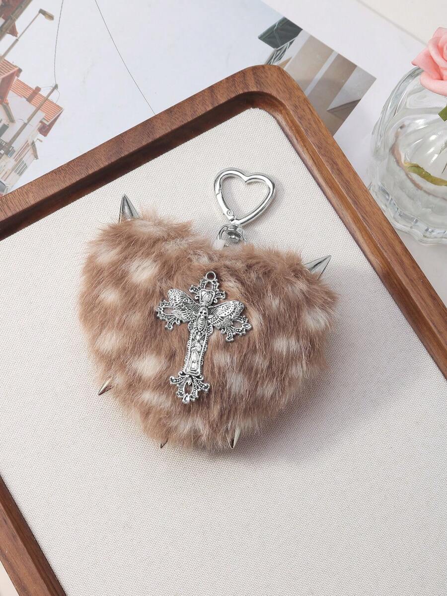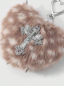 Kawaii 1 pieza Llavero con colgante de corazón cruzado 3D con remaches, estampado de leopardo de piel sintética marrón, estilo retro punk gótico Y2K, adecuado para mujeres, uso diario o regalo, Halloween