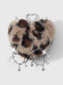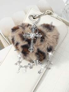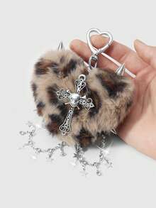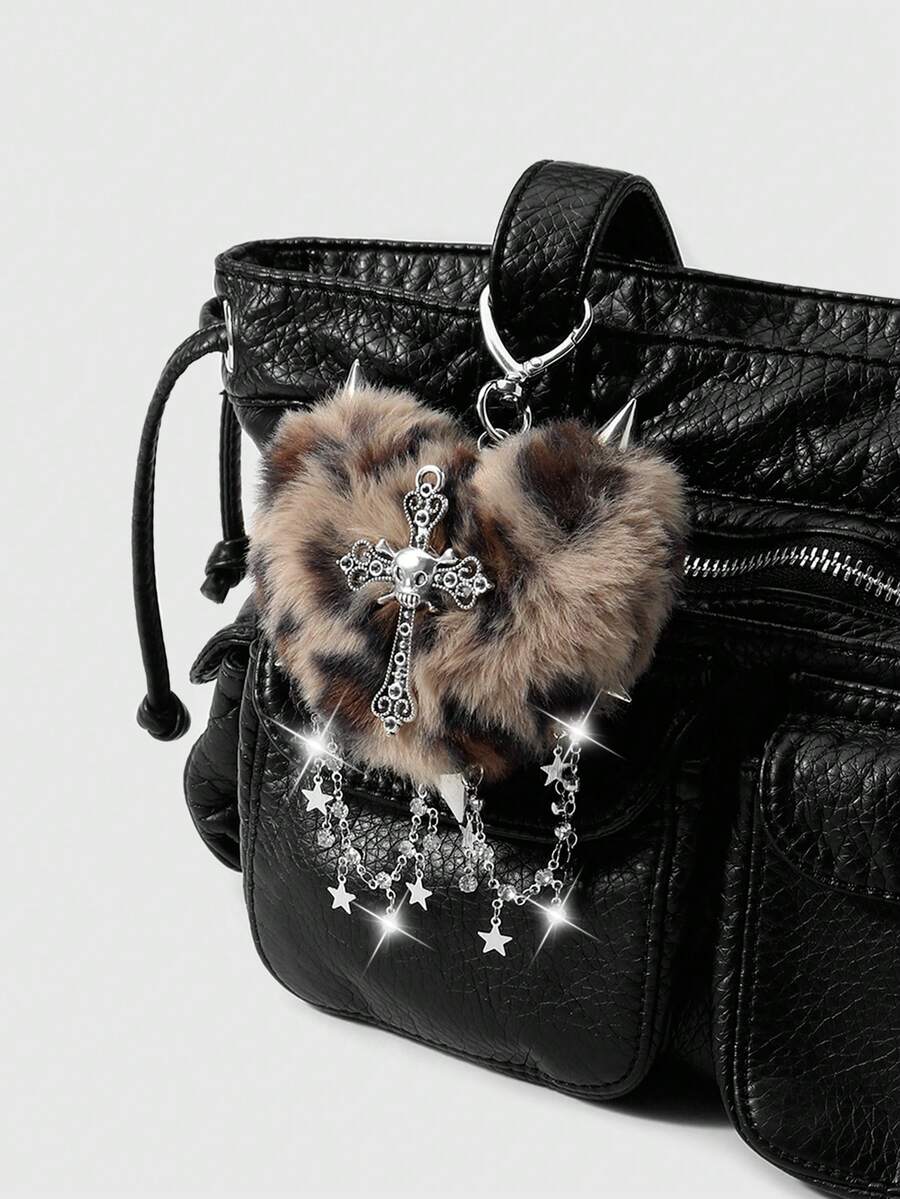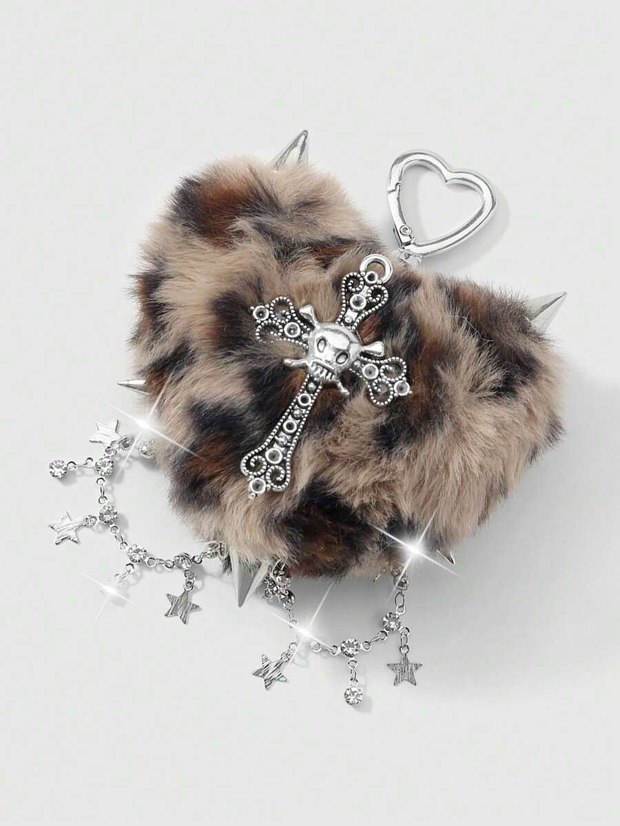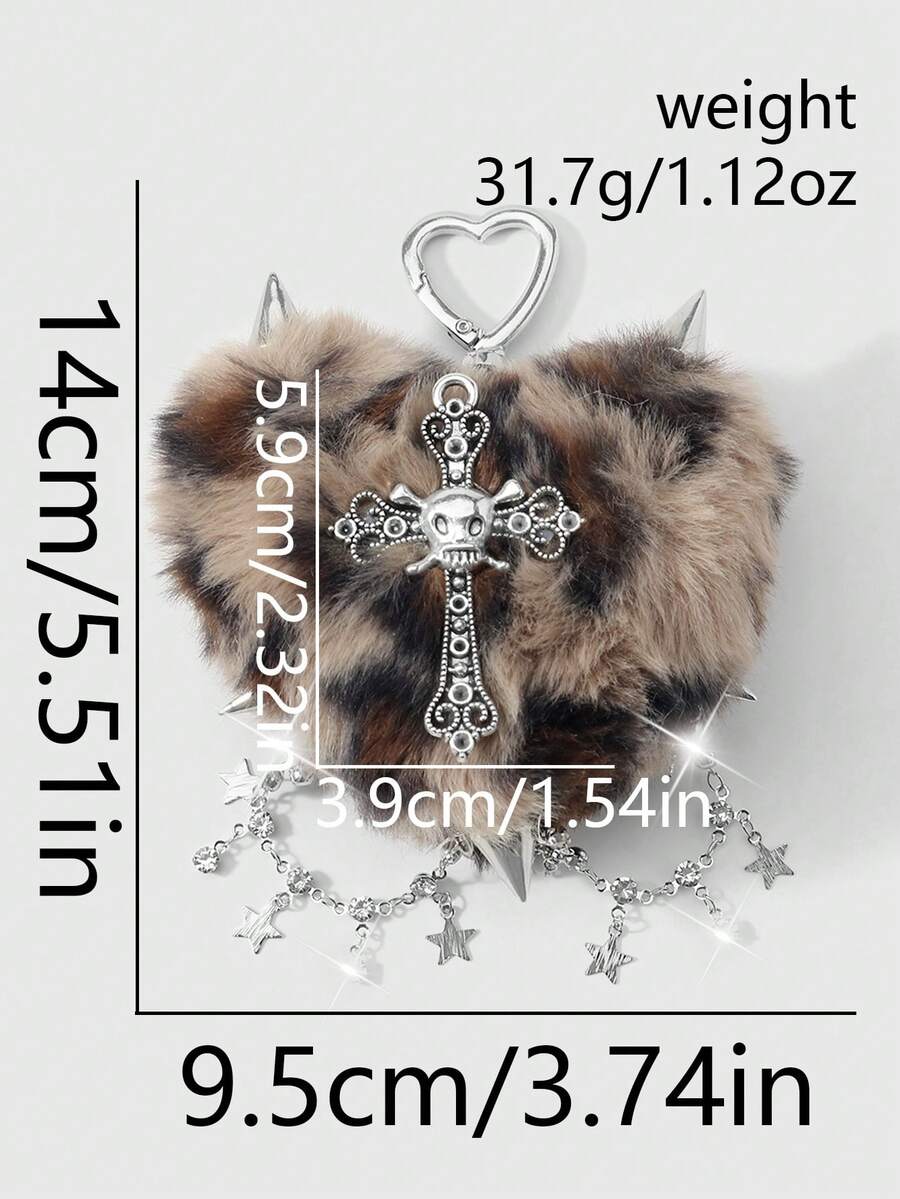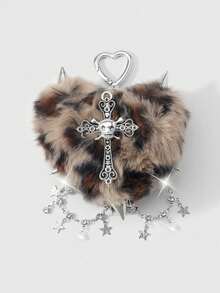 Kawaii 1 pieza Llavero con colgante de corazón cruzado 3D con remaches, estampado de leopardo de piel sintética marrón, estilo retro punk gótico Y2K, adecuado para mujeres, uso diario o regalo, Halloween