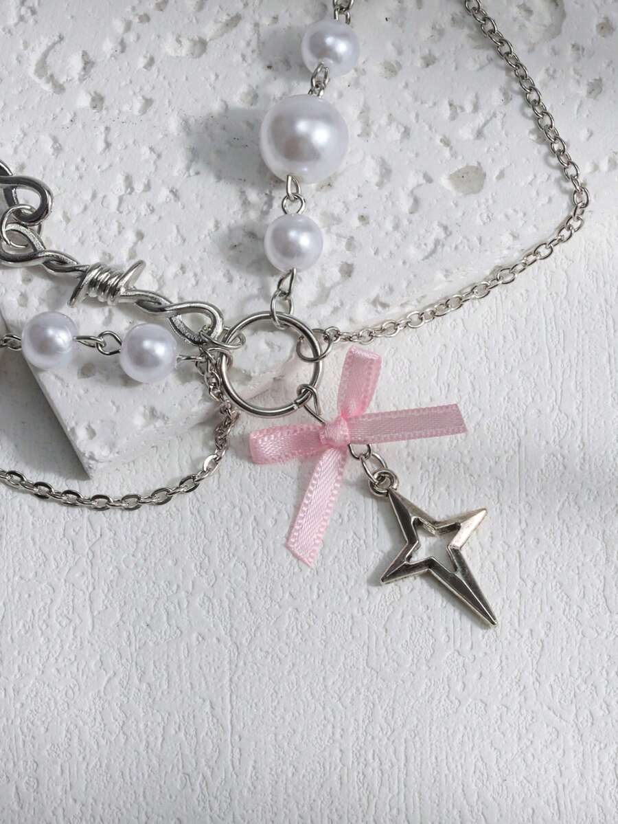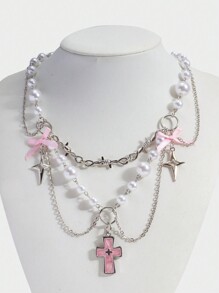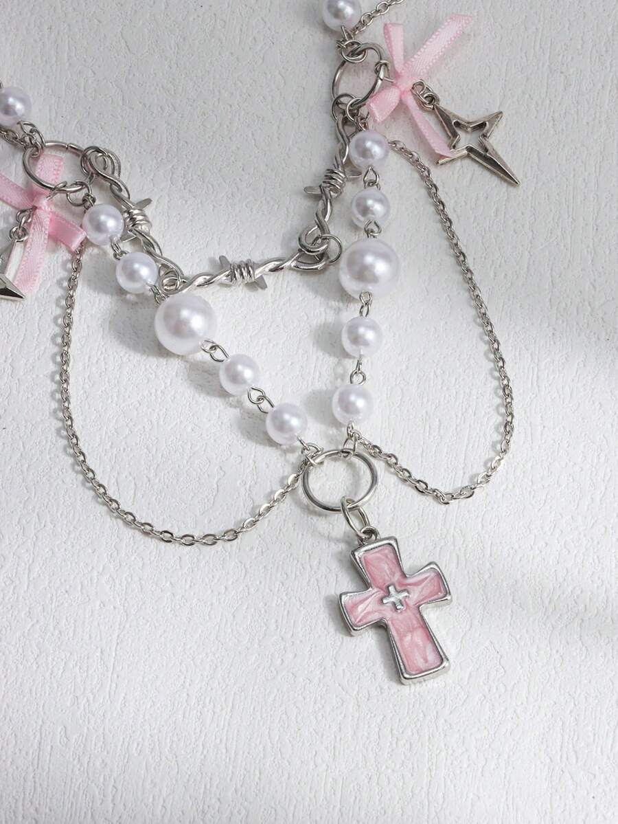 Kawaii 1 pieza Collar con colgante de cruz rosa estilo Y2K, collar decorativo con mariposa y estrella para mujeres