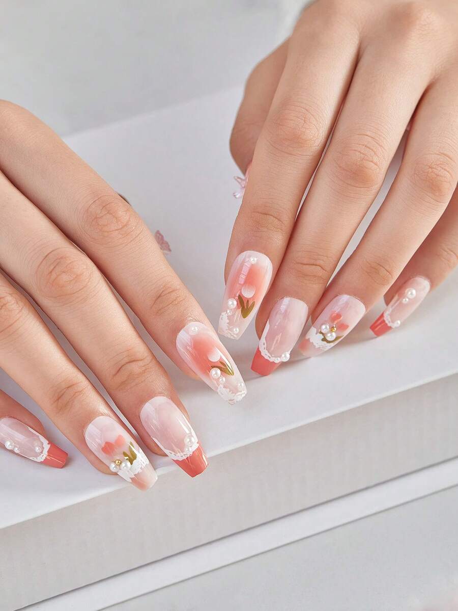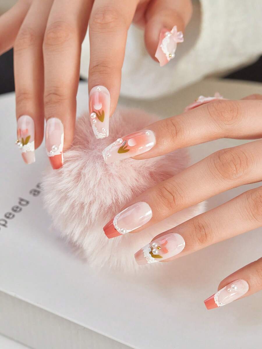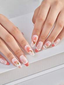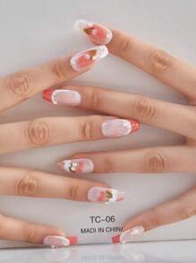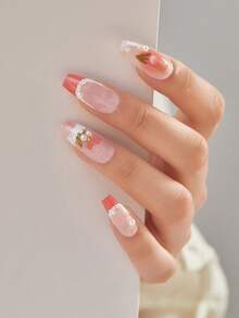 Kawaii 24 piezas ataúd 3d con diseño de perla artificial Uña postiza & 1 hoja cinta
