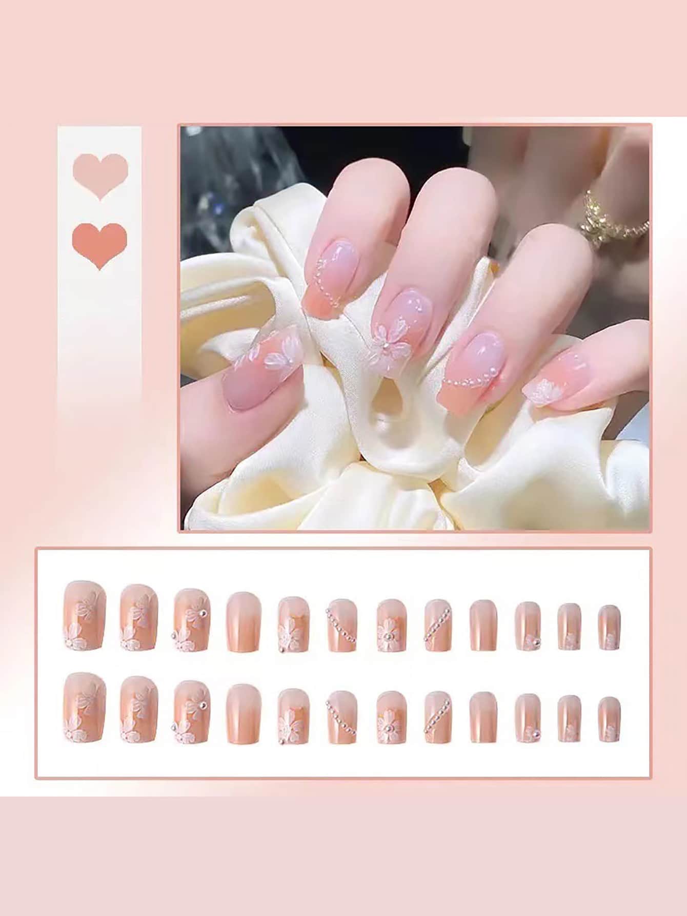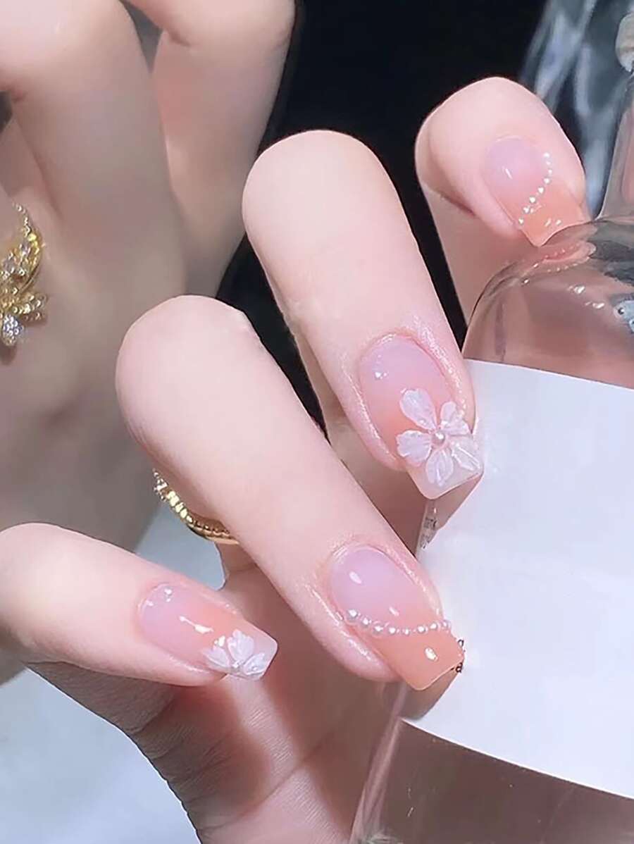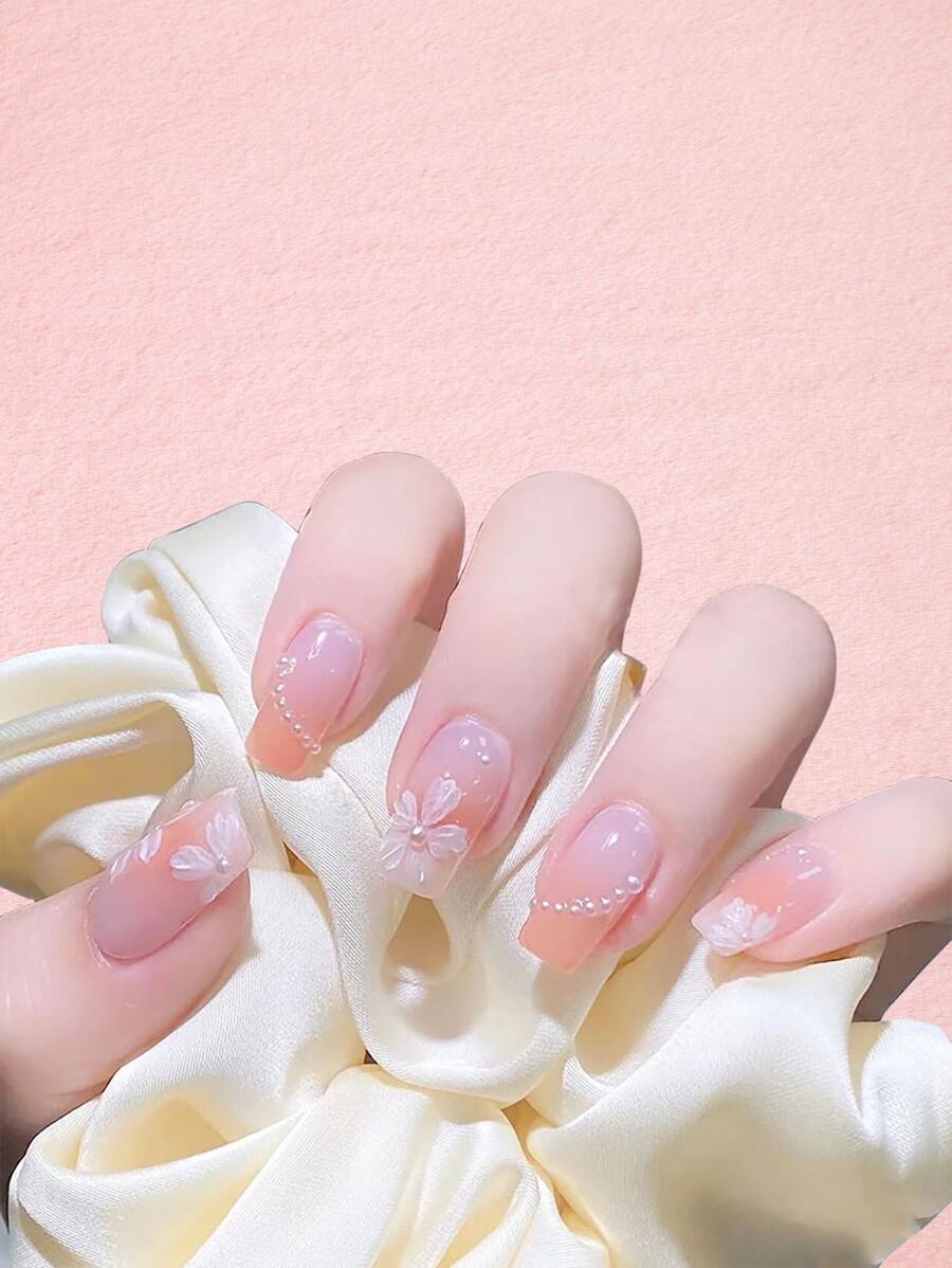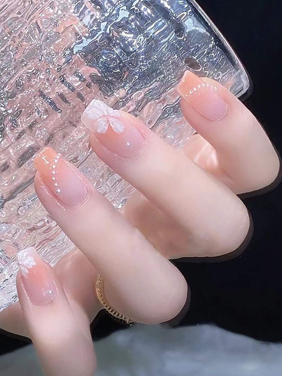Kawaii 24 piezas Uña postiza con diseño de flor de ombré