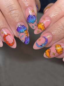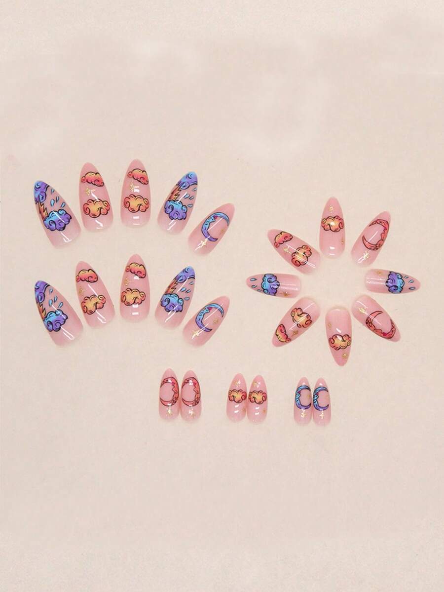 Kawaii 24 piezas corto almendra con estampado de dibujos animados Uña postiza & 1 pieza lima de uñas & 1 hoja cinta