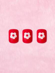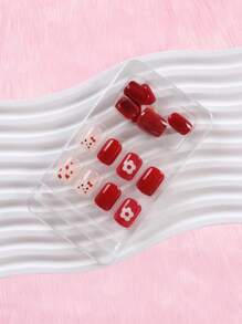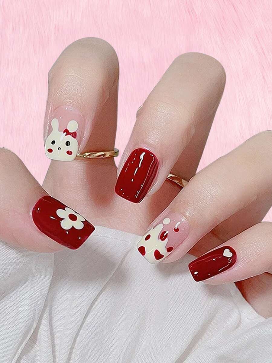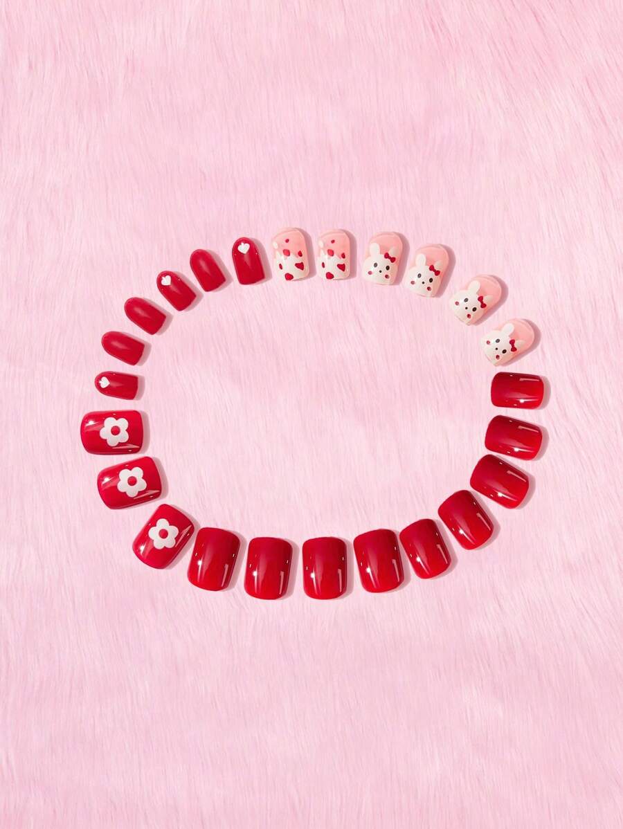 Kawaii 24 piezas cuadrado conejo & con estampado de flor Uña postiza & 1 hoja cinta