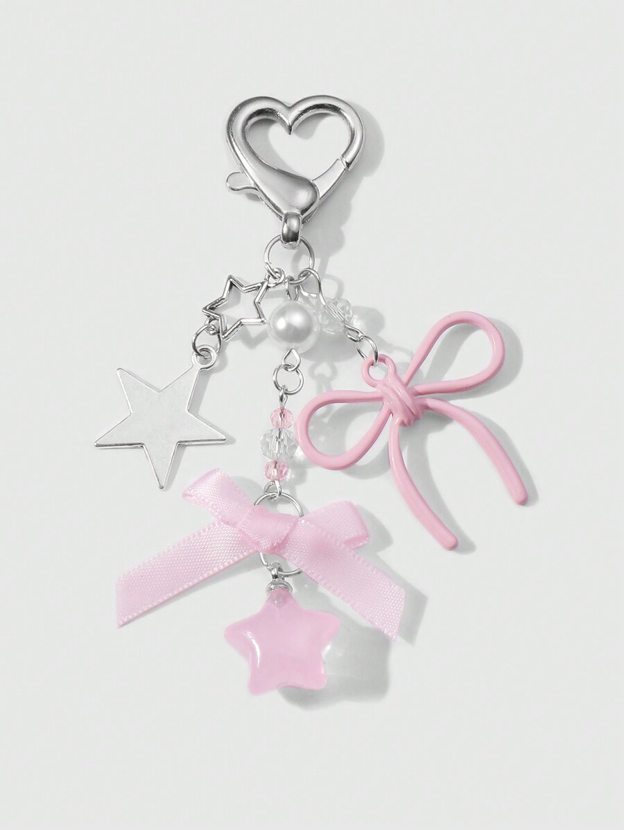 Kawaii 2 piezas Estilo coreano INS lindo minimalista de alta calidad cadena plateada con estrella, lazo de cinta rosa falso perla, accesorio de teléfono con lazo de estrella y corazón, llavero y colgante para bolso, incluye clip anti-pérdida, adecuado para mujeres y niñas, excelente como accesorio diario o regalo