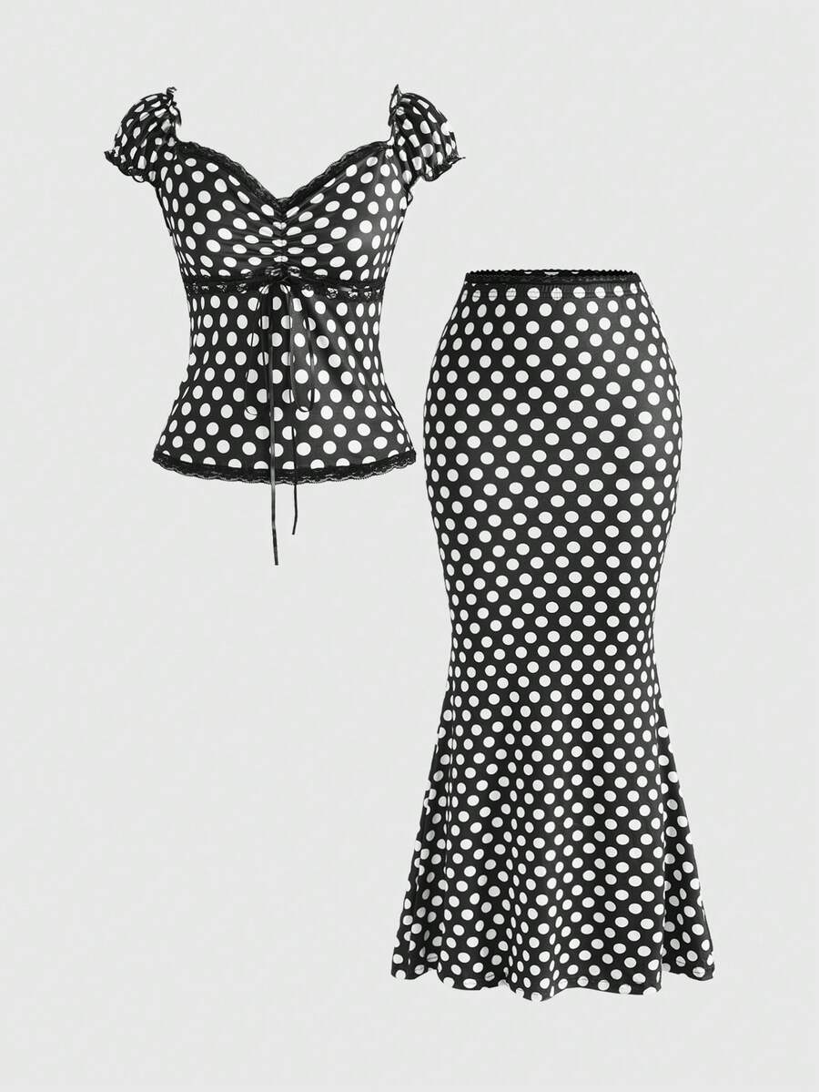Kawaii Set de 2 piezas con blusa de ajuste ceñido con cuello en V, decoración de moño y parche de encaje a lunares, talla grande falda