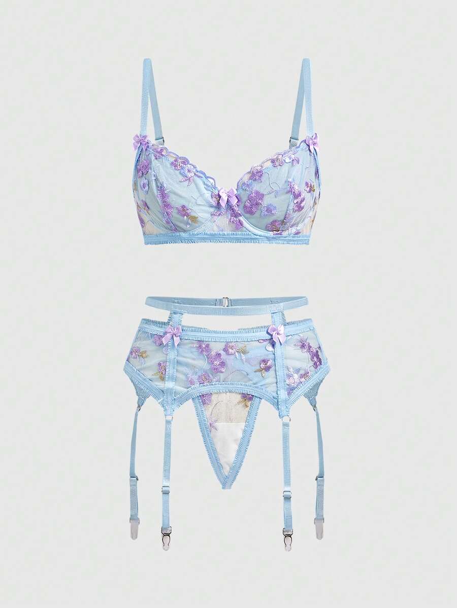 Kawaii Conjunto de lencería sexy de 3 piezas con sujetador con aros, tanga y liguero con bordado floral romántico