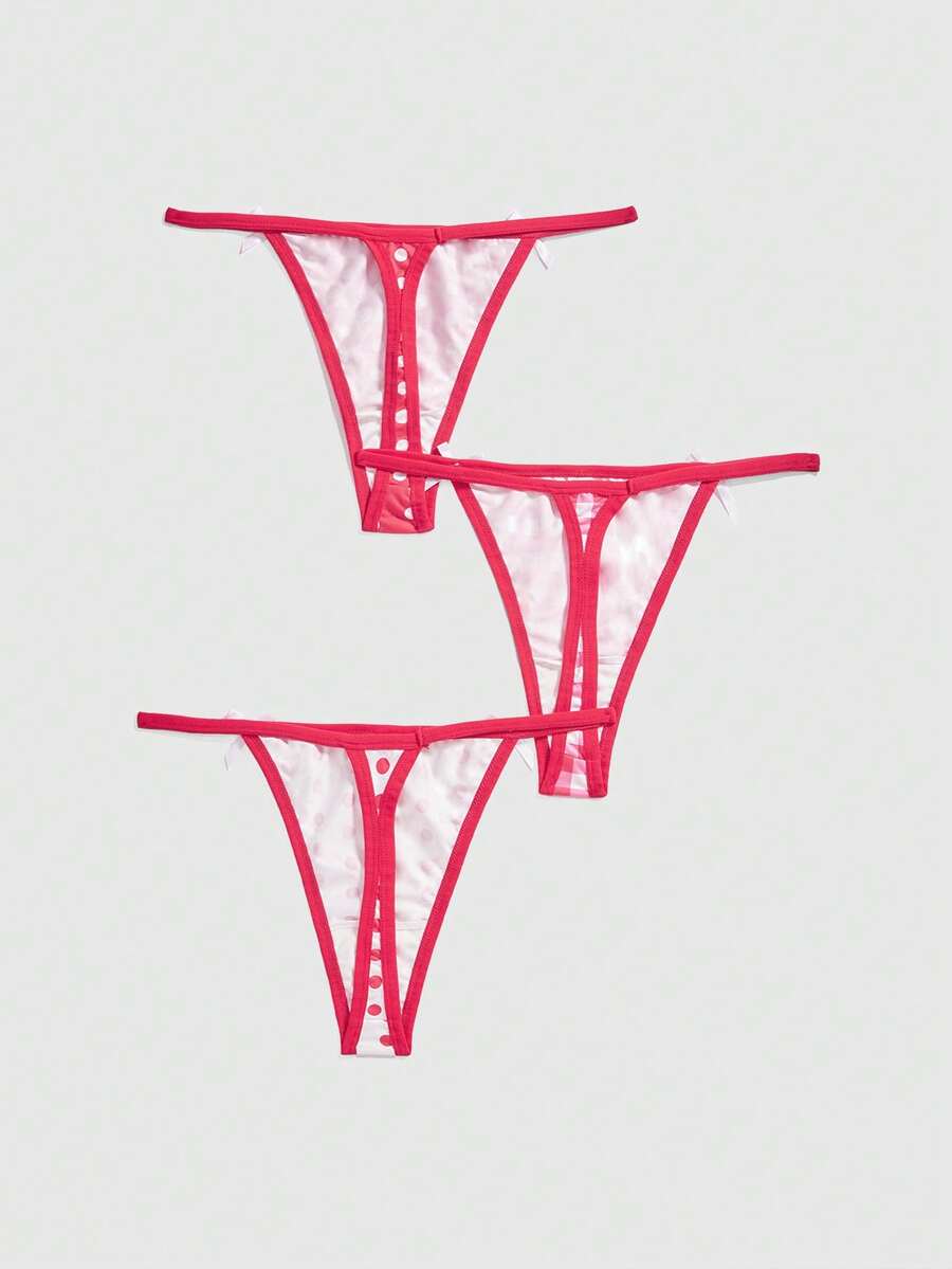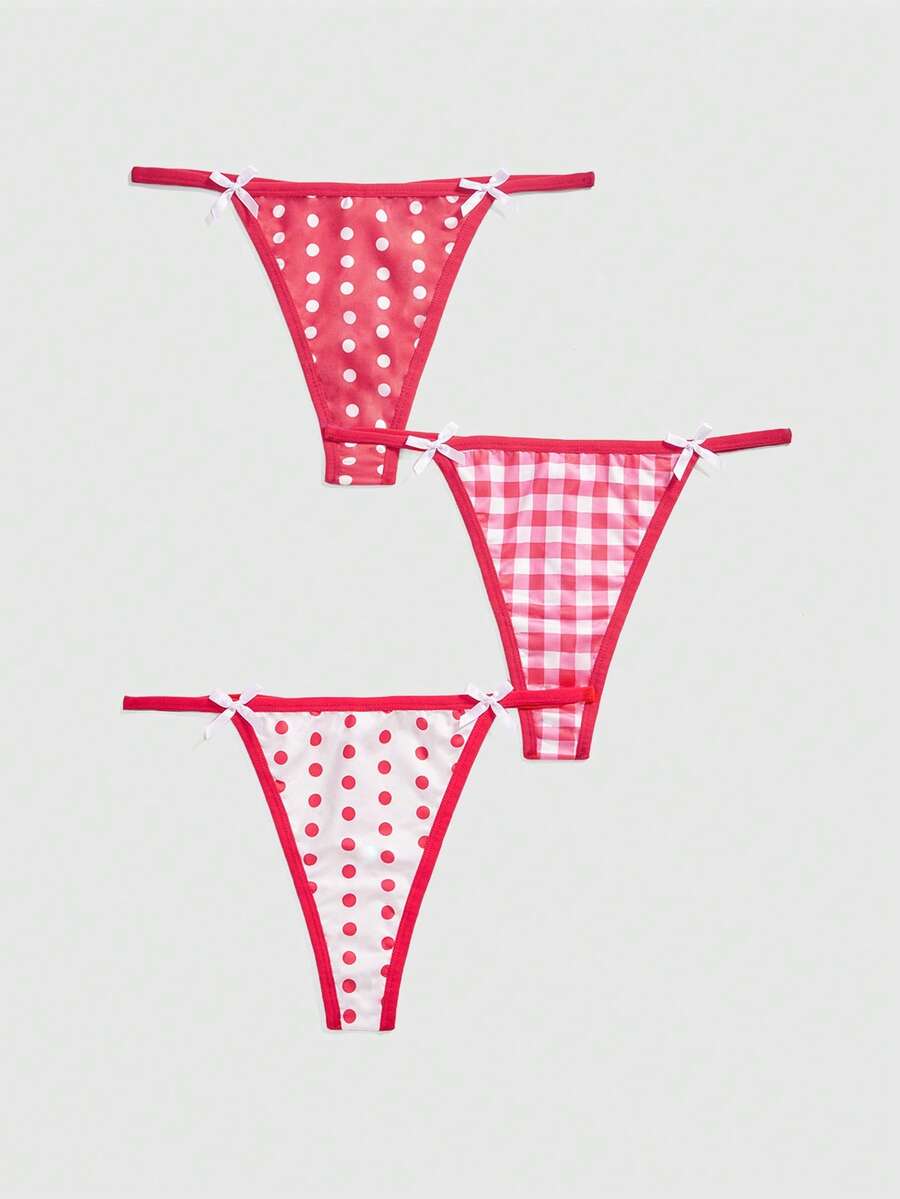 Kawaii Set de 3 piezas de tanga de mujer con decoración de lunares y cuadros en estilo lindo y dulce