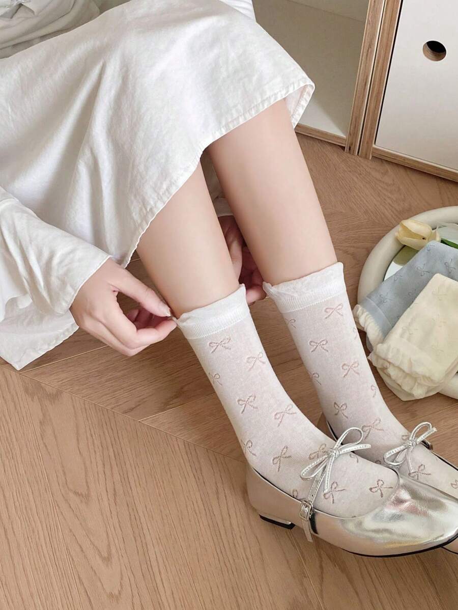 Kawaii 5 pares de calcetines de invierno con lazo y volantes de colores aleatorios, calcetines estilo Lolita de boca de burbujas y volantes que llegan hasta la pantorrilla, calcetines de estilo JK coloridos, calcetines casuales versátiles para mujer