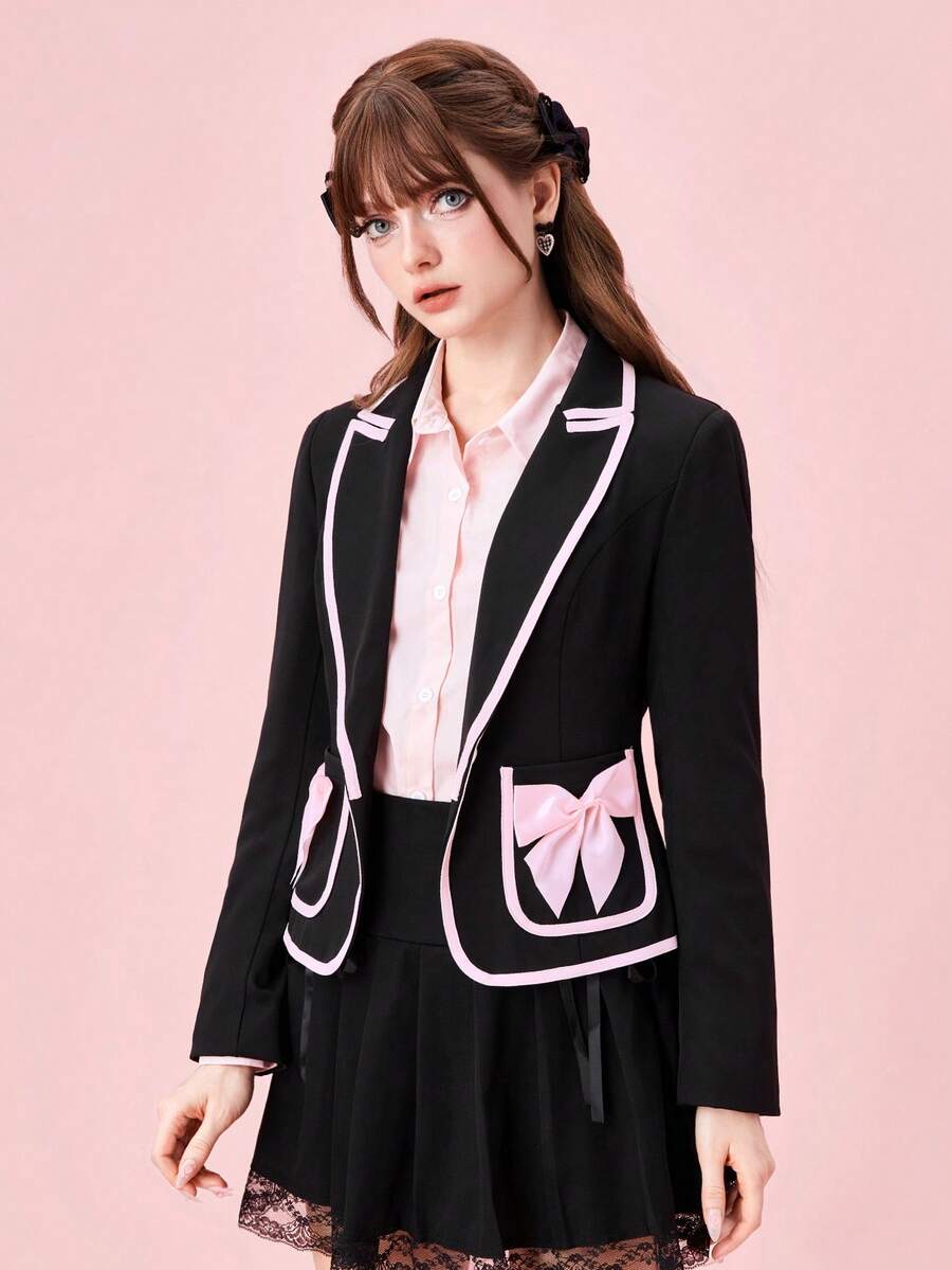 Kawaii Blazer para mujer con acento de lazo estilo universitario estadounidense, ribete rosa, para la escuela