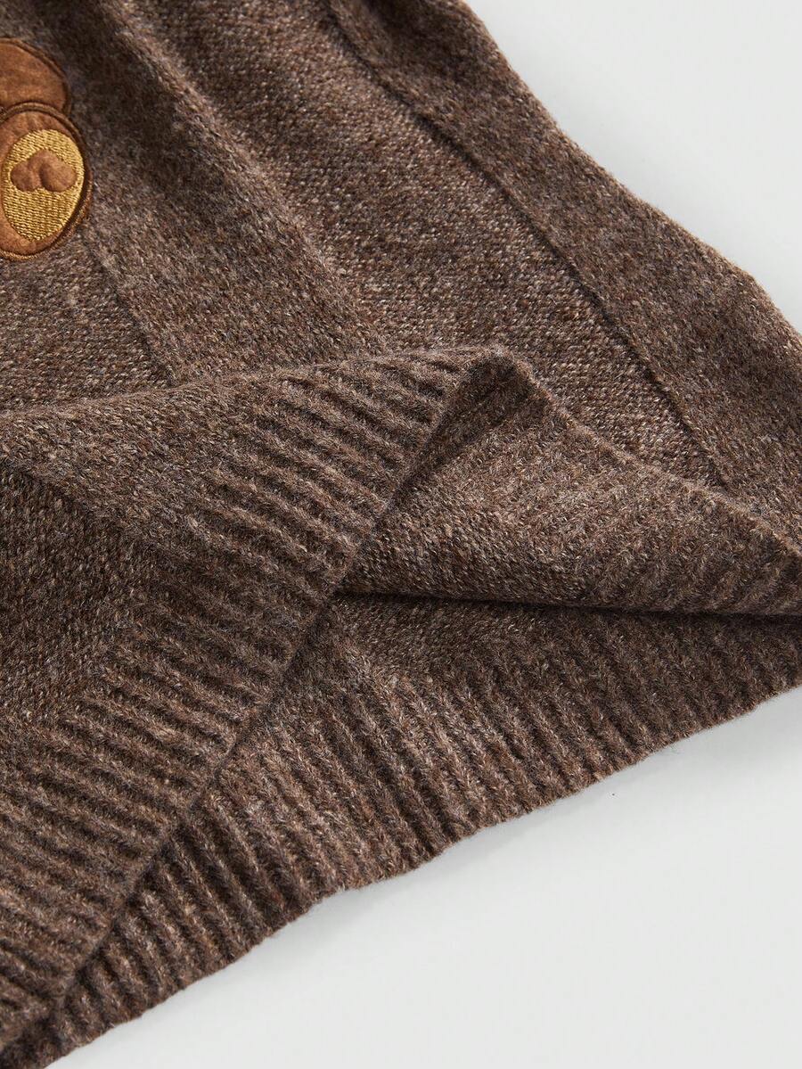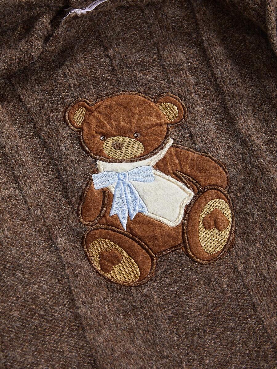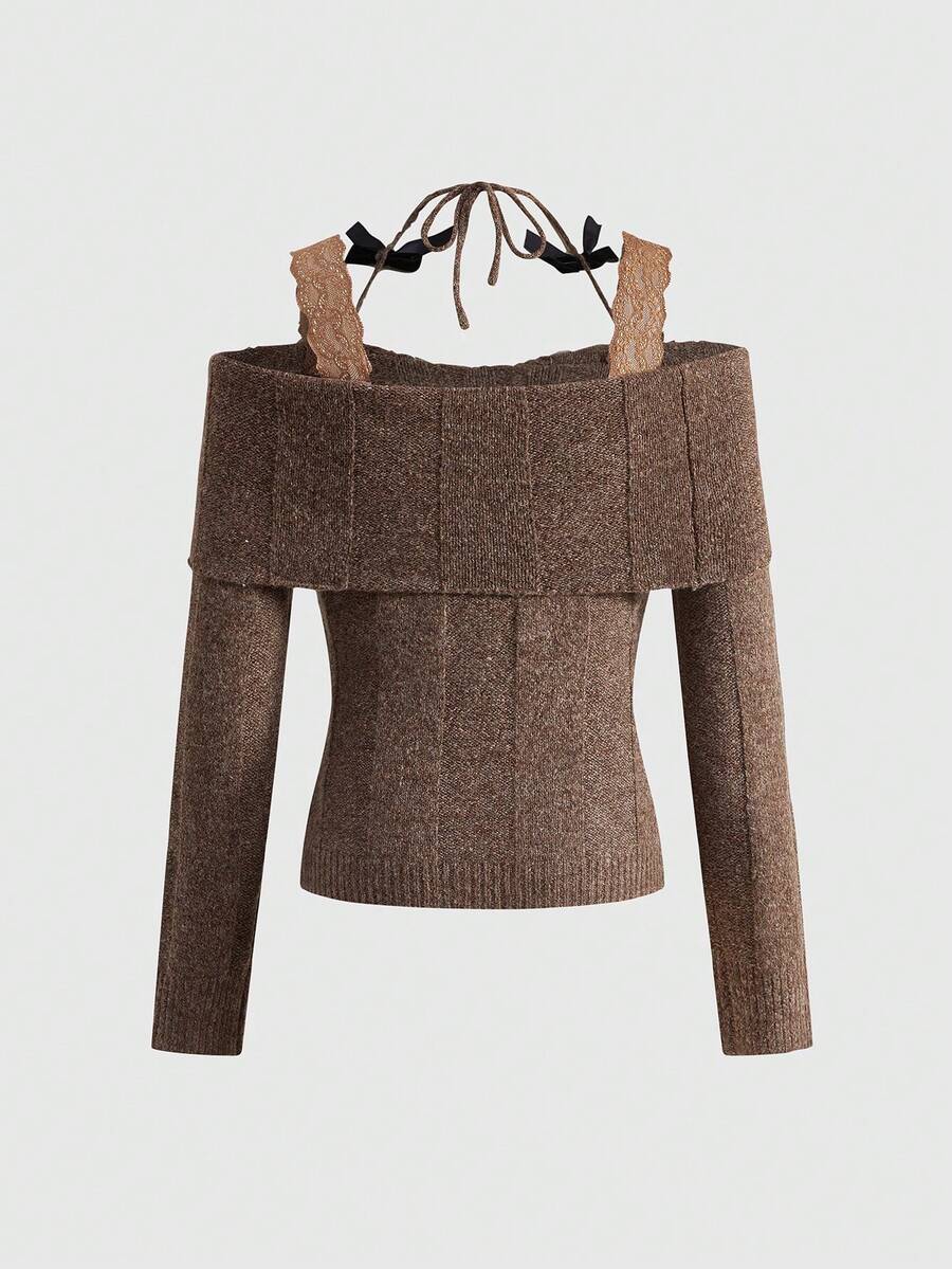 Blusa ajustada de punto sexy con hombros descubiertos, diseño de lazo y parches de encaje con estampado de oso kawaii para mujeres