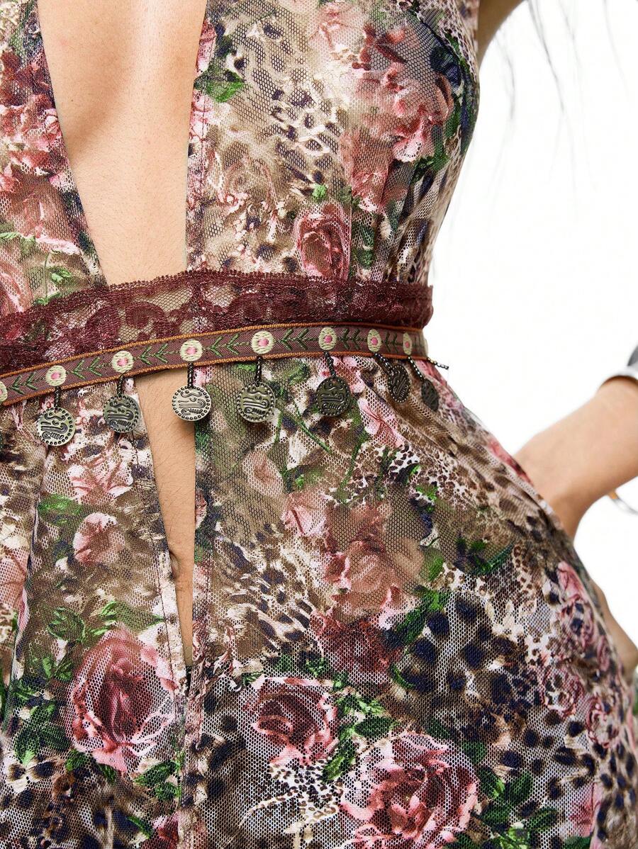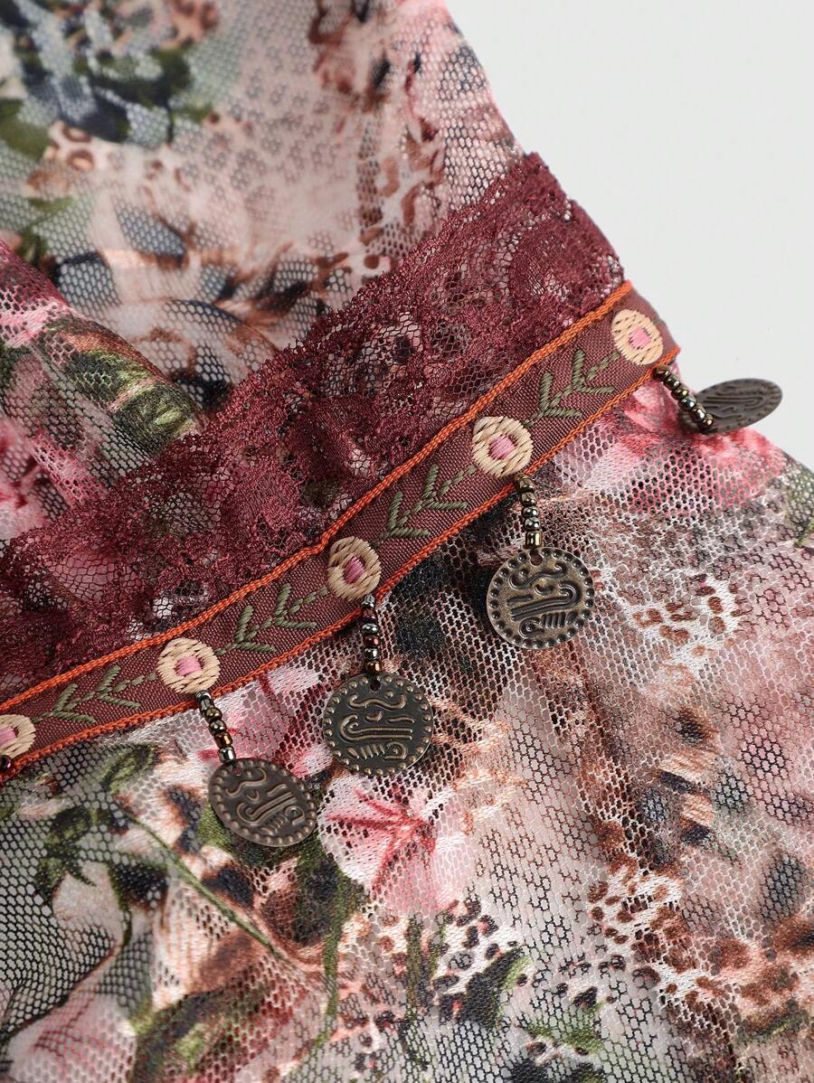 Kawaii Blusa transparente con estampado de encaje floral y de leopardo, con escote descubierto, de estilo bohemio vintage, adecuada para festivales de música de verano