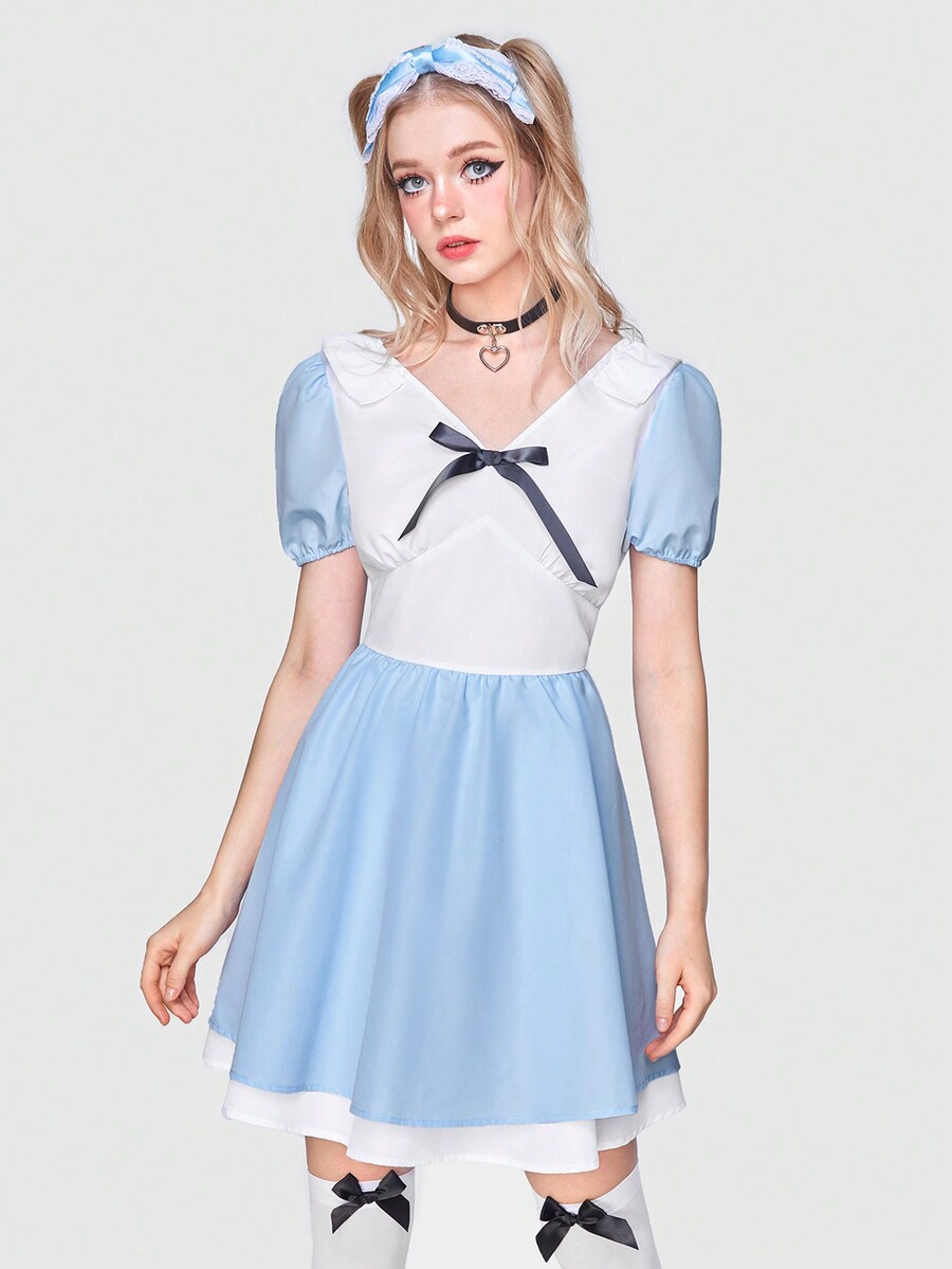 Kawaii Vestido línea A con diseño de lazo de manga farol ribete con fruncido