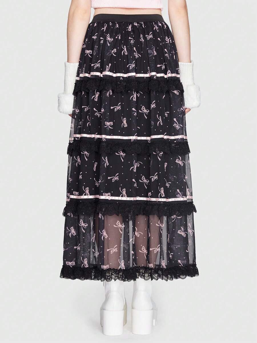 Kawaii Falda con estampado de lazo ribete con encaje con malla
