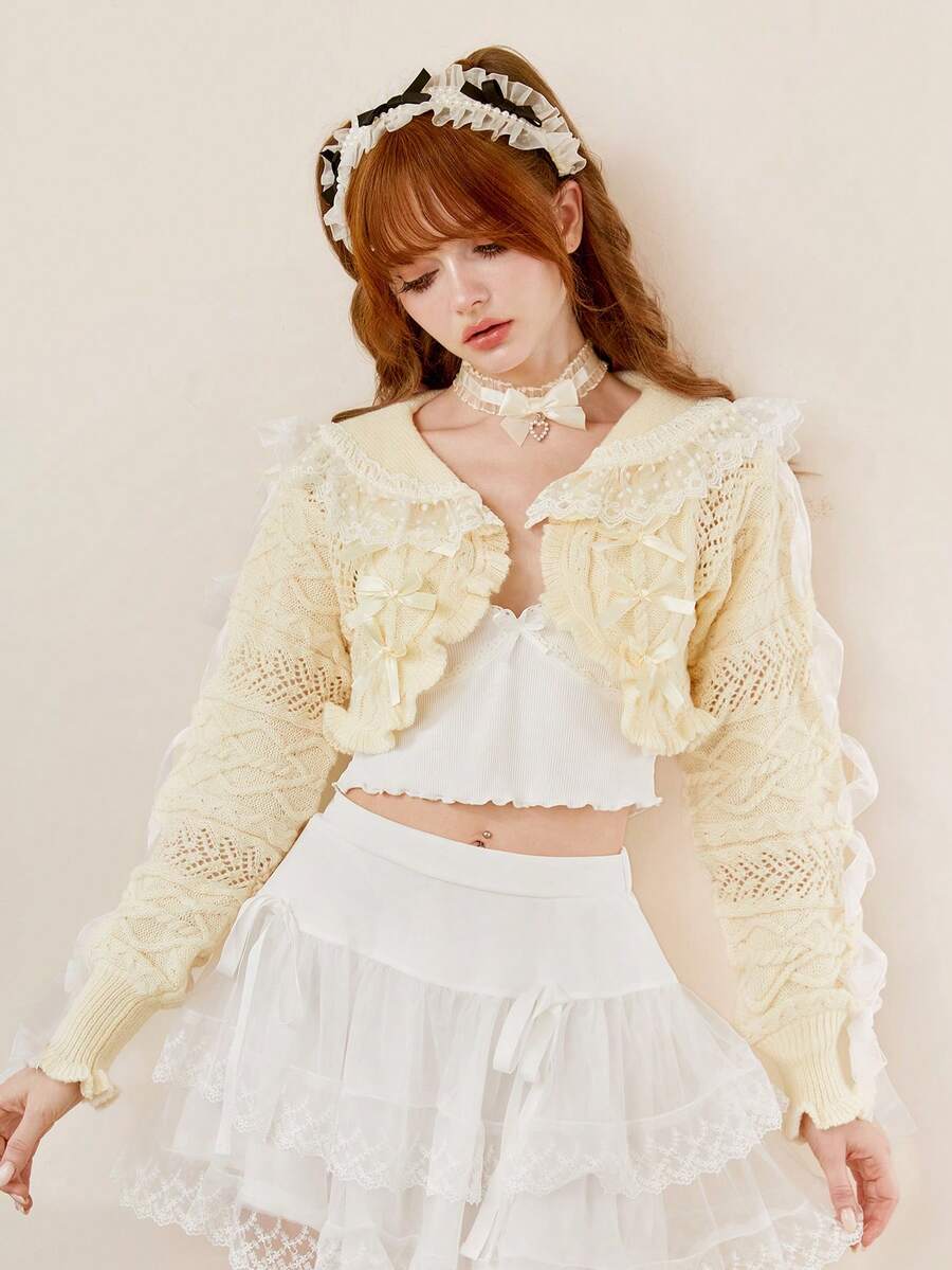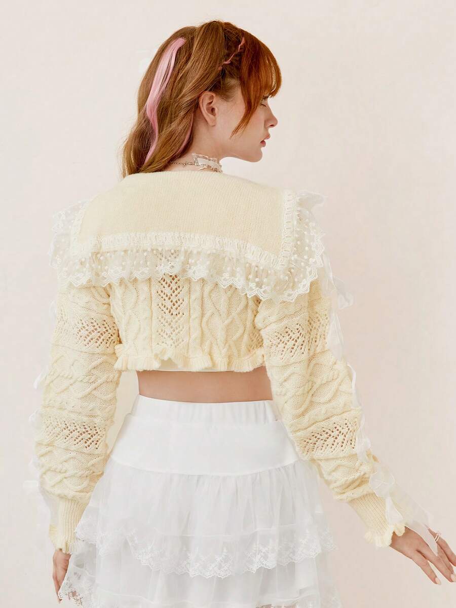Kawaii Cárdigan crop lazo ribete con fruncido de punto de malla