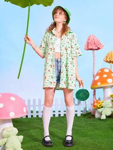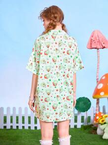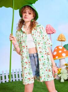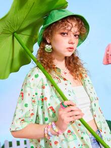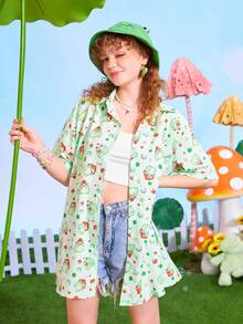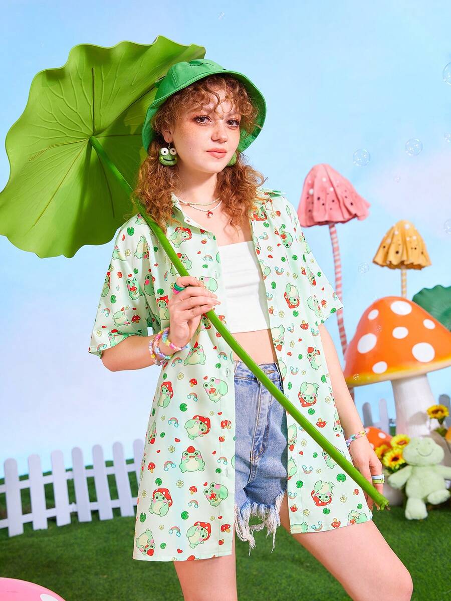 Kawaii Camisa con estampado de dibujos animados con botón delantero