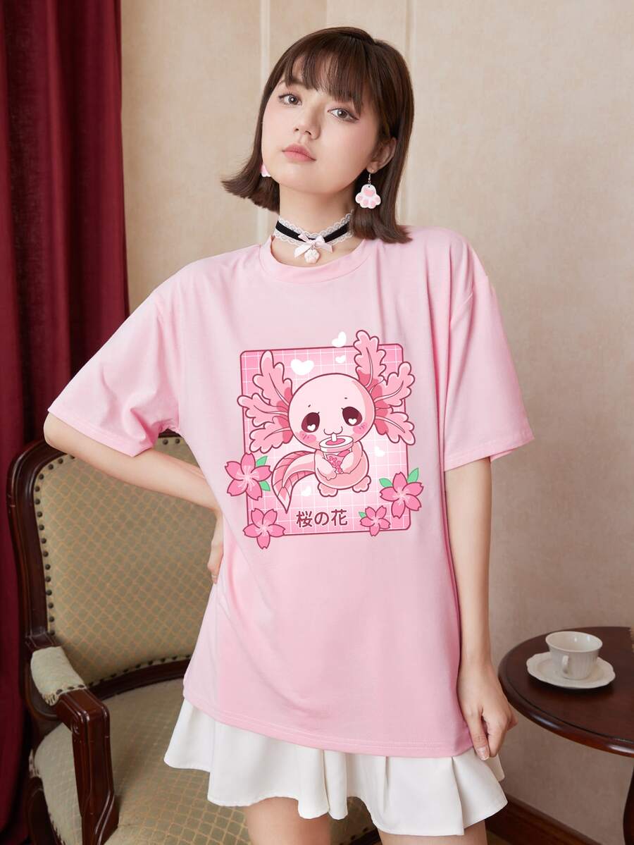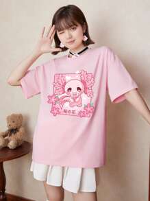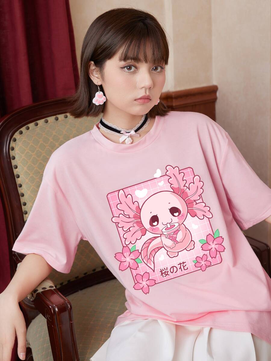 Kawaii Camiseta De Hombro Caído Con Gráfico De Dibujos Animados