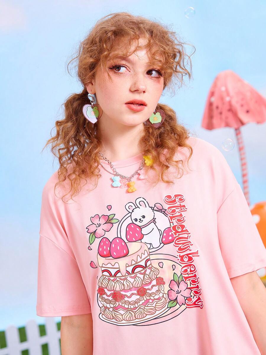Kawaii Camiseta de hombros caídos con estampado de dibujos animados