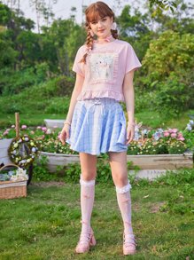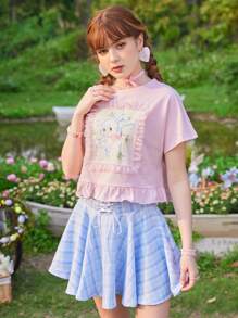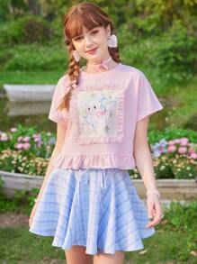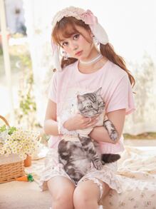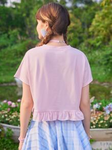 Kawaii Camisetas de Mujer Encaje en contraste Volante Dibujos animados Casual