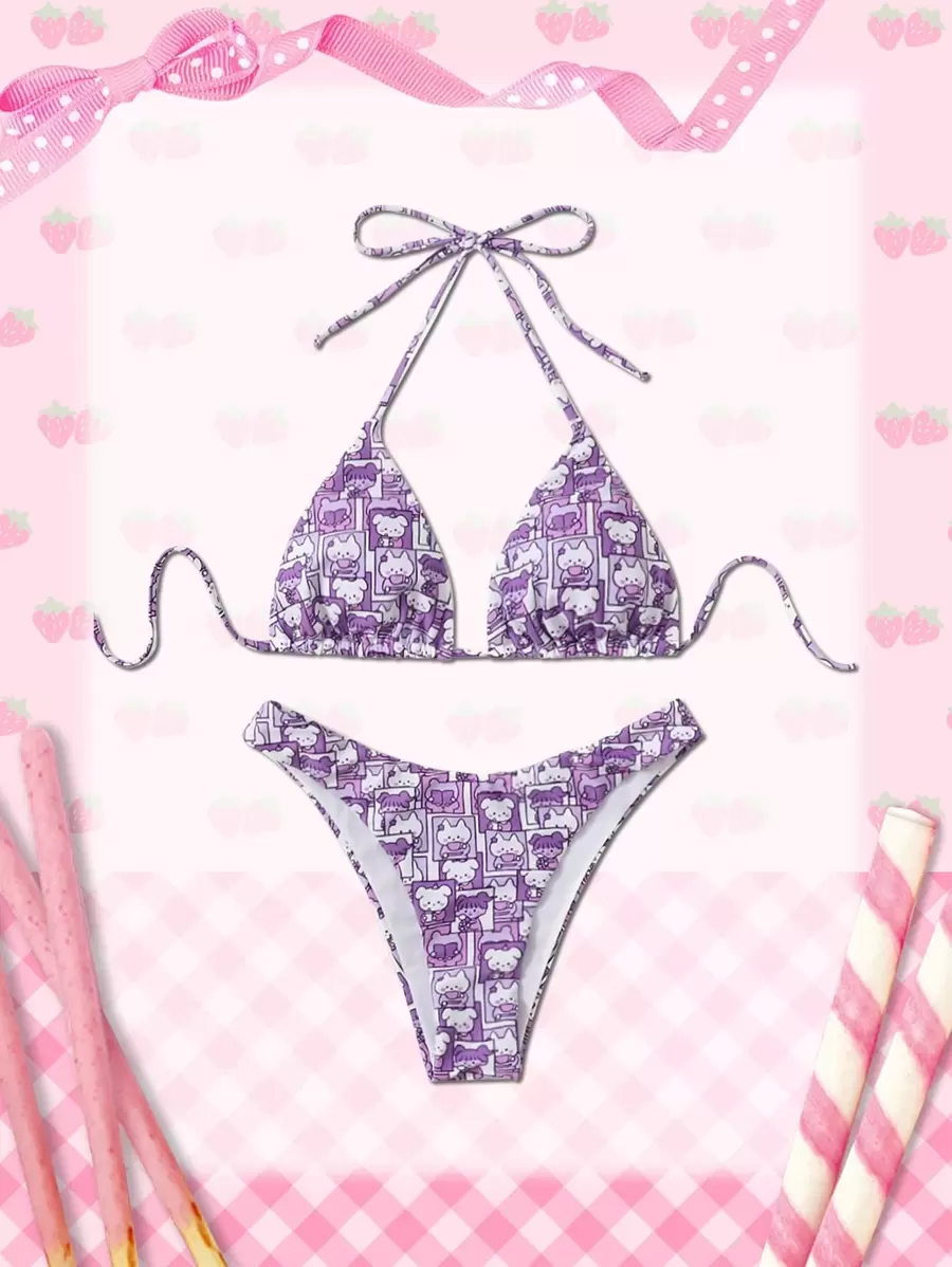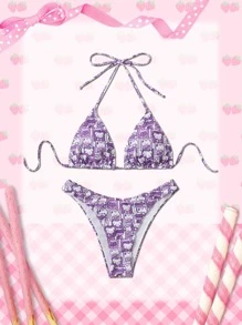 Kawaii Conjunto de bikini de verano para playa con diseño de triángulo cuello halter estampado con dibujos animados