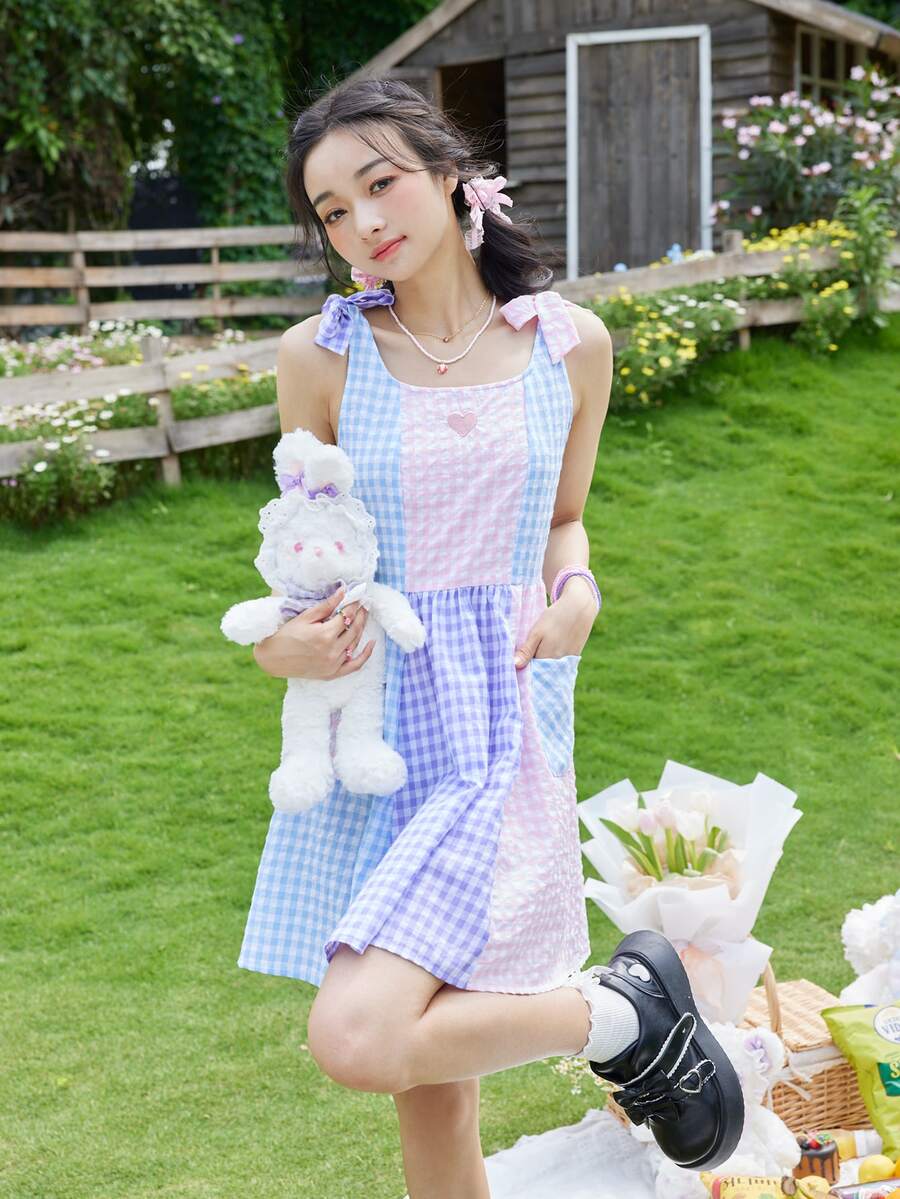 Kawaii Vestido de color combinado de guingán con bolsillo