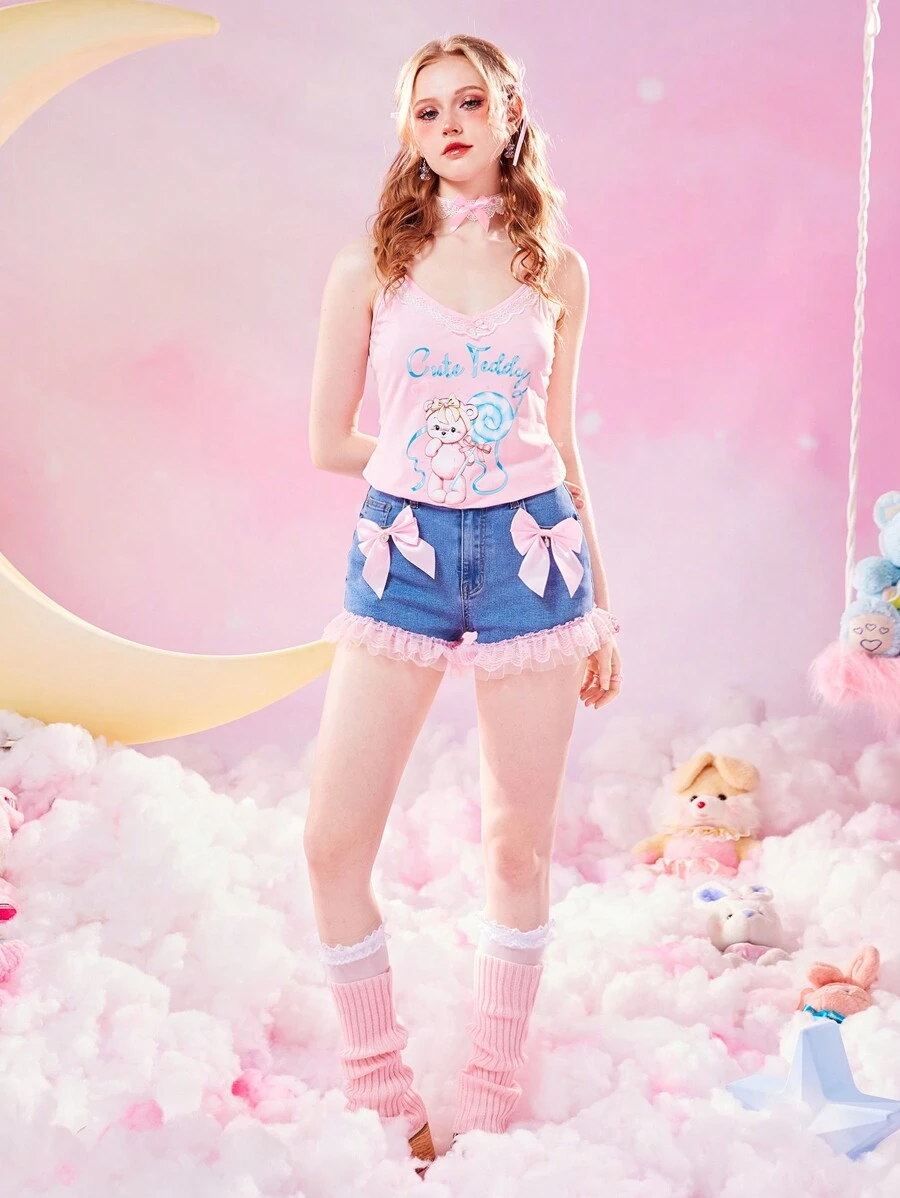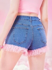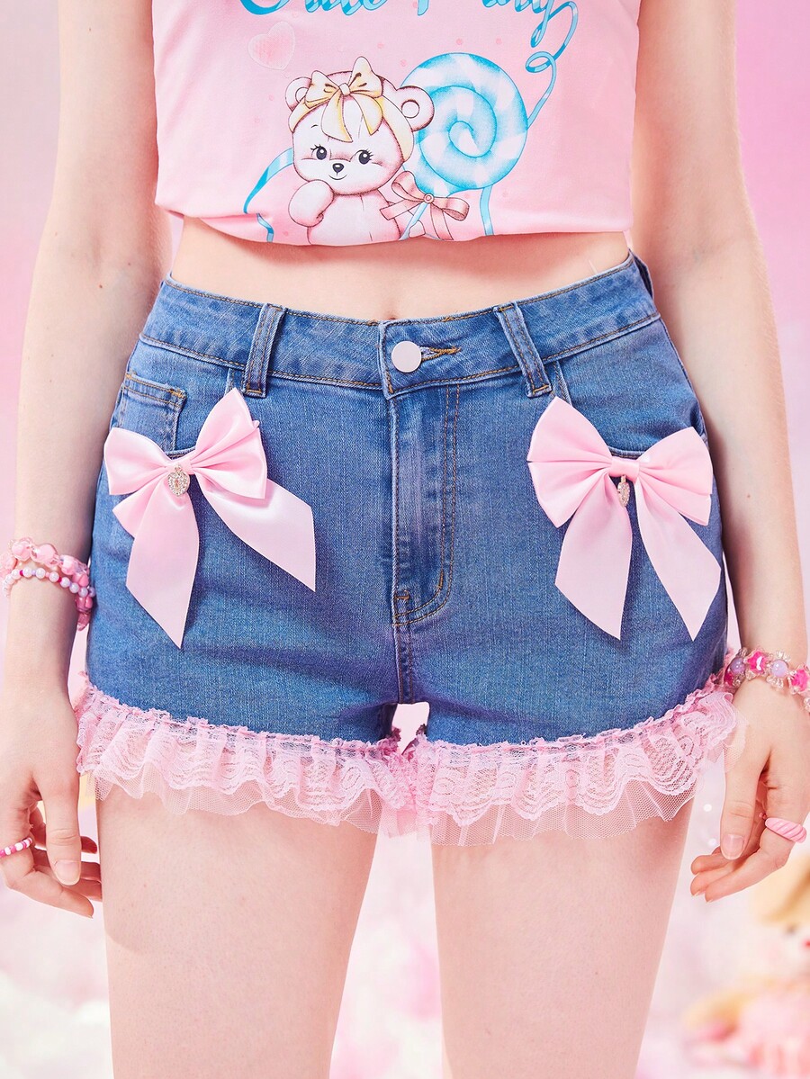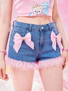 Kawaii Shorts en mezclilla con encaje en contraste con diseño de lazo