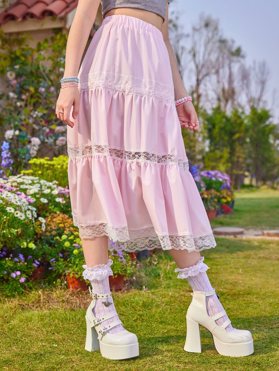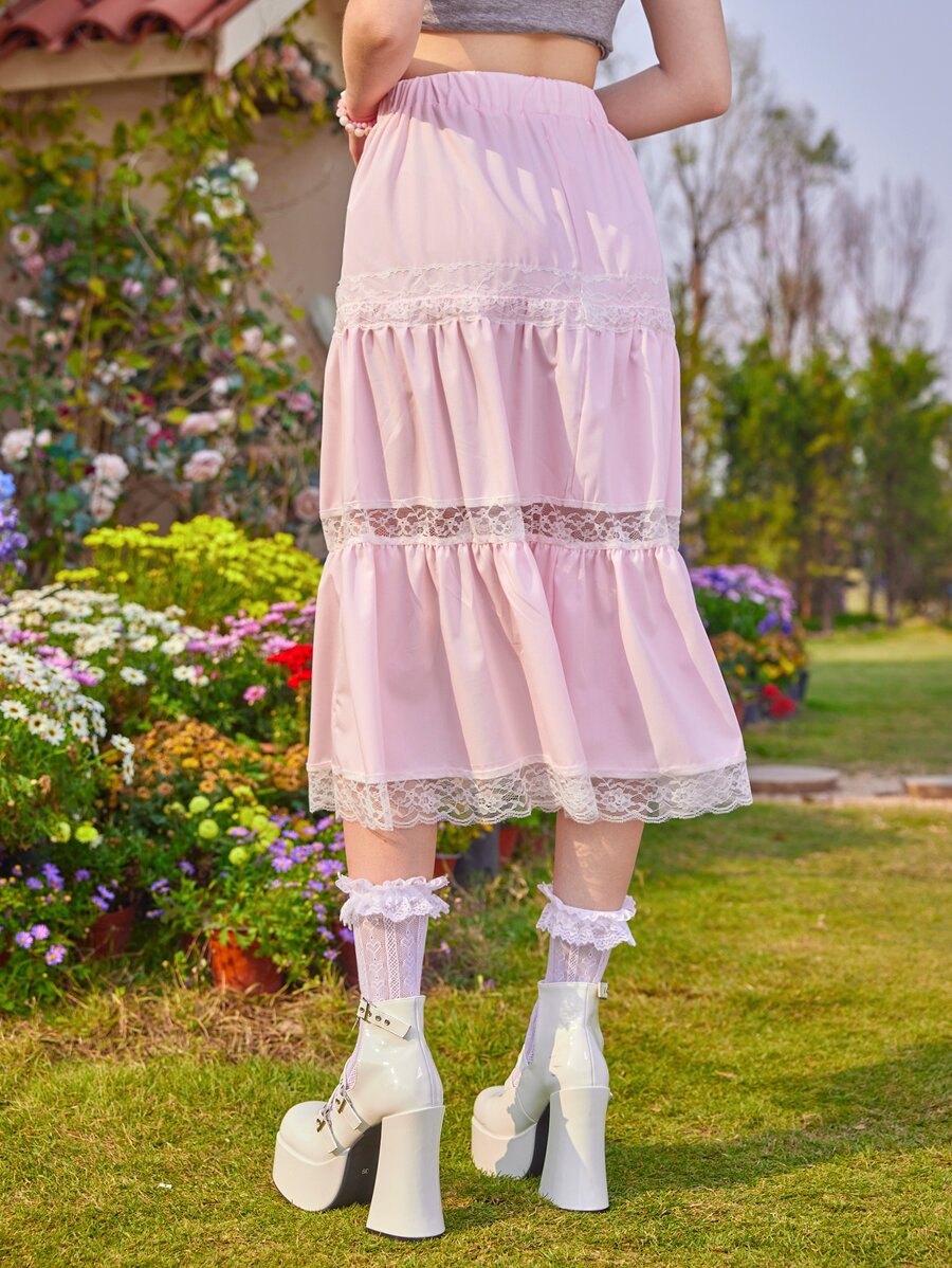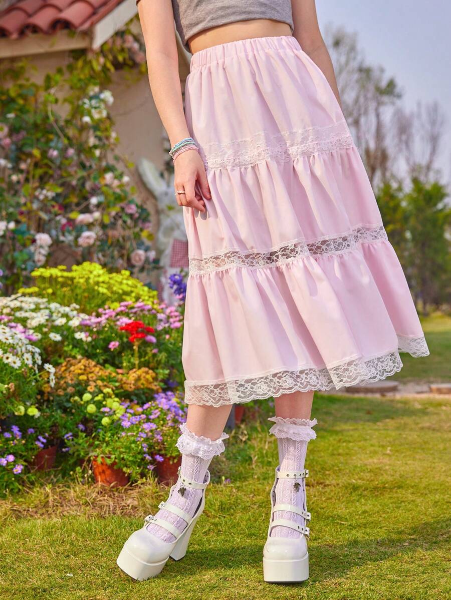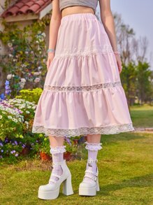 Kawaii Falda con encaje en contraste bajo con fruncido
