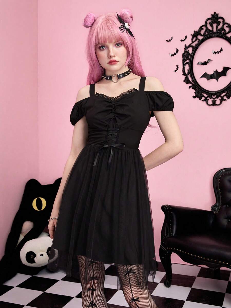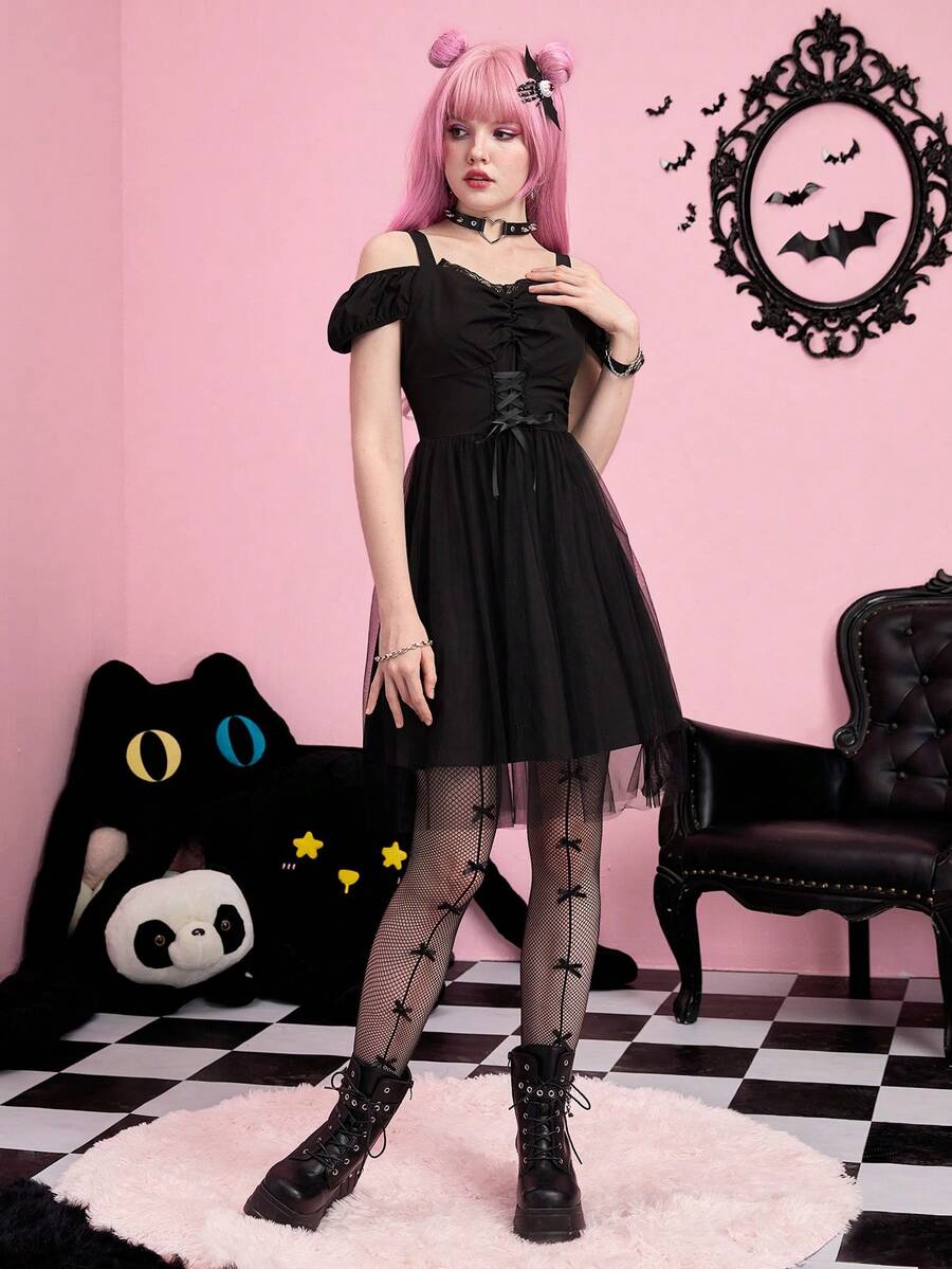 Kawaii Vestido de malla en contraste con cordón lazo