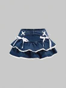 Kawaii Falda pantalón de mezclilla con aplique de pastel lindo y lacito