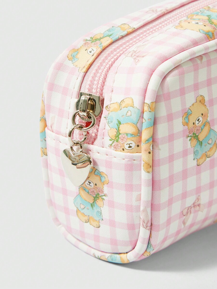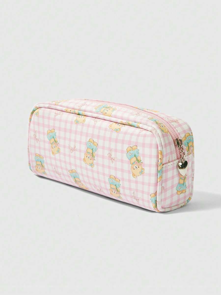 Kawaii Lindo estuche de lápices de osito de cuadros animado, soporte de papelería de escritorio de gran capacidad para estudiantes, bolsa organizadora creativa minimalista para maquillaje, 1 pieza