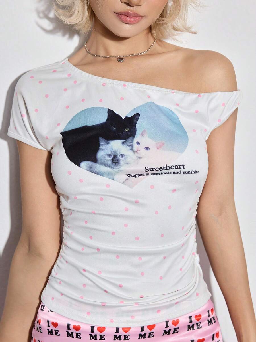 Kawaii Camiseta con estampado de gato y lunares, con manga asimétrica y retorcida, adecuada para verano, playa, ceremonia de graduación, festival de música, concierto, cita, vacaciones y otras ocasiones