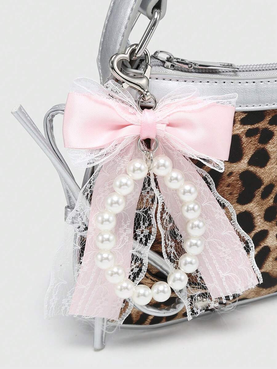 Kawaii Lindo colgante de bolso con forma de corazón, moño y perlas falsas