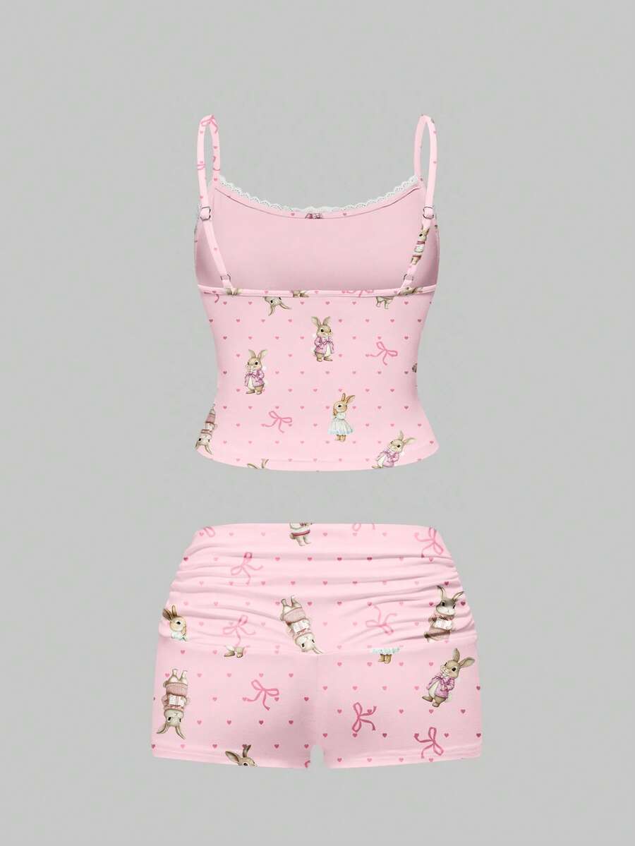 Kawaii Conjunto de pijama con camiseta de tirantes con encaje y lunares y shorts fruncidos, ropa de estar por casa casual y divertida con diseño de conejo